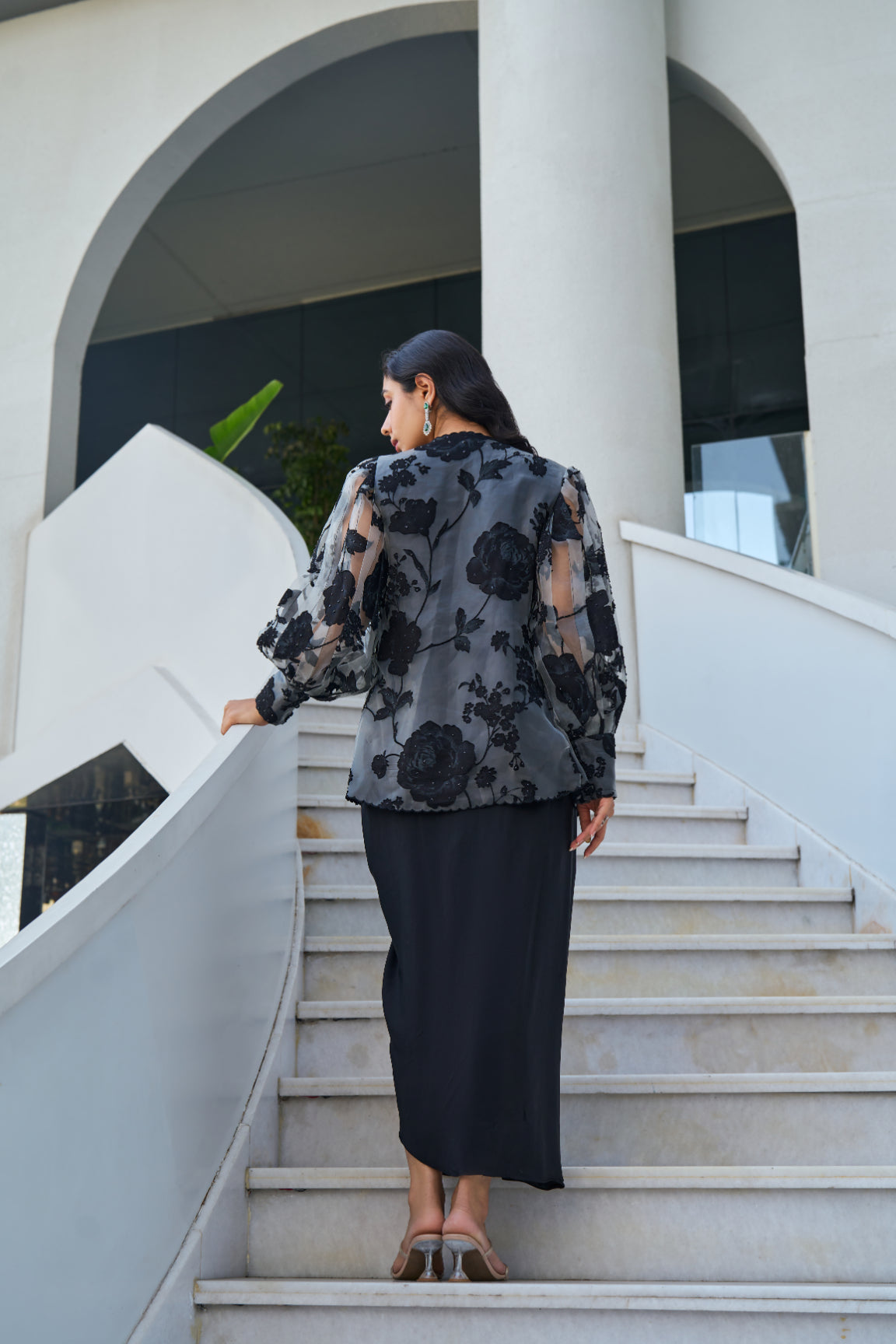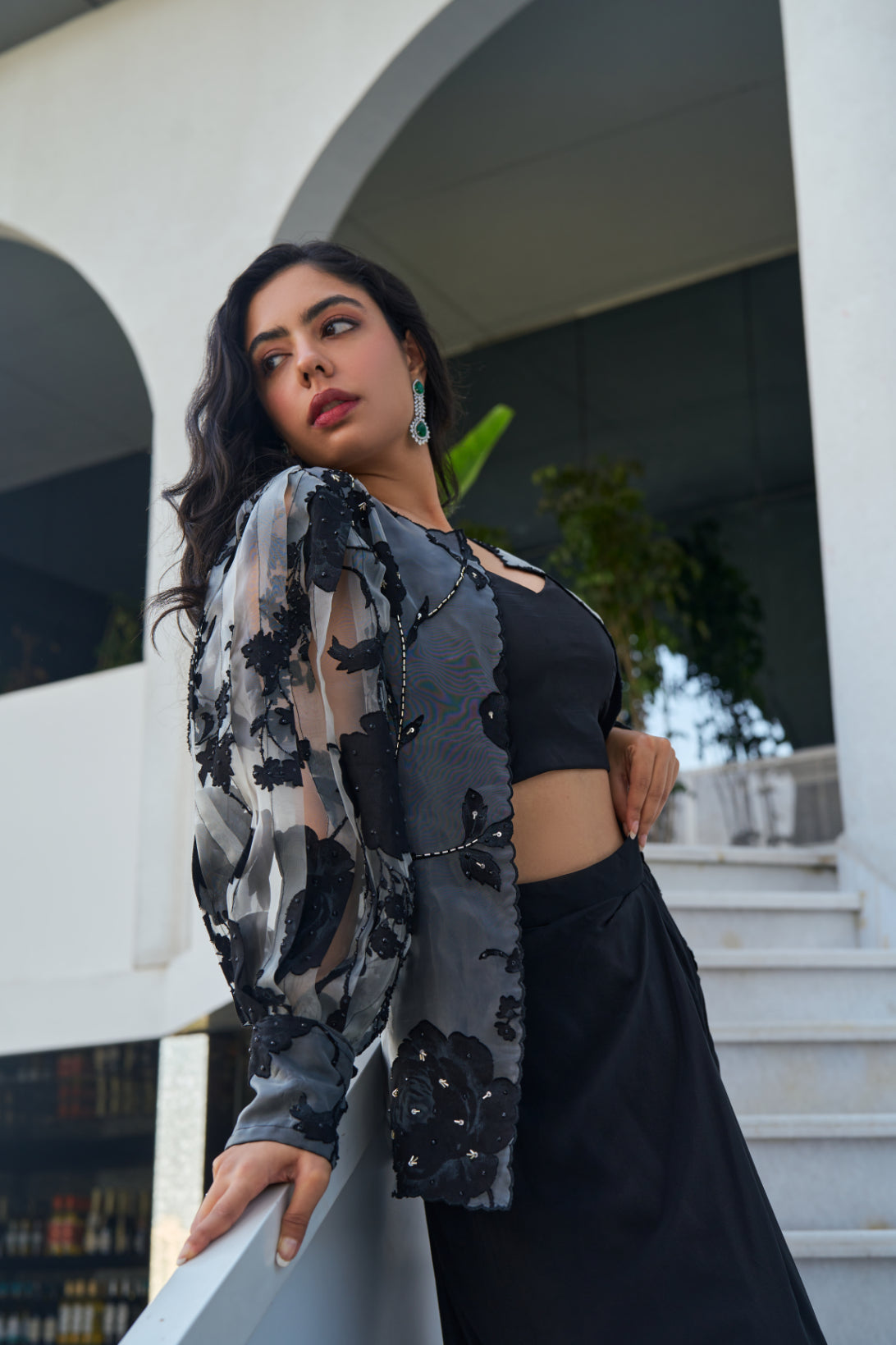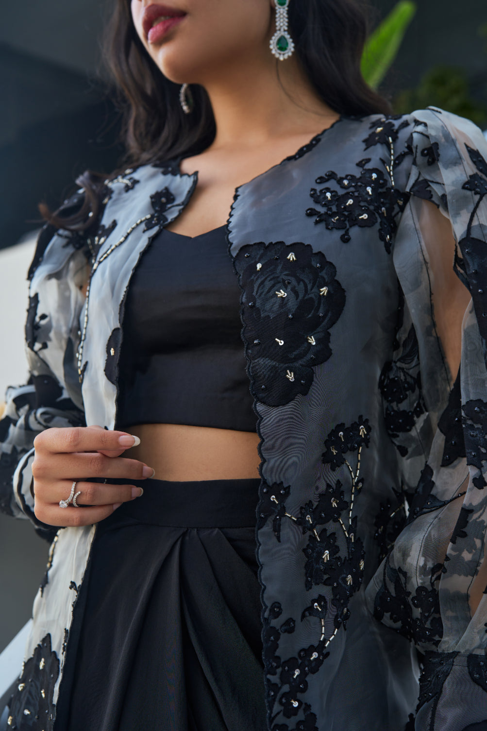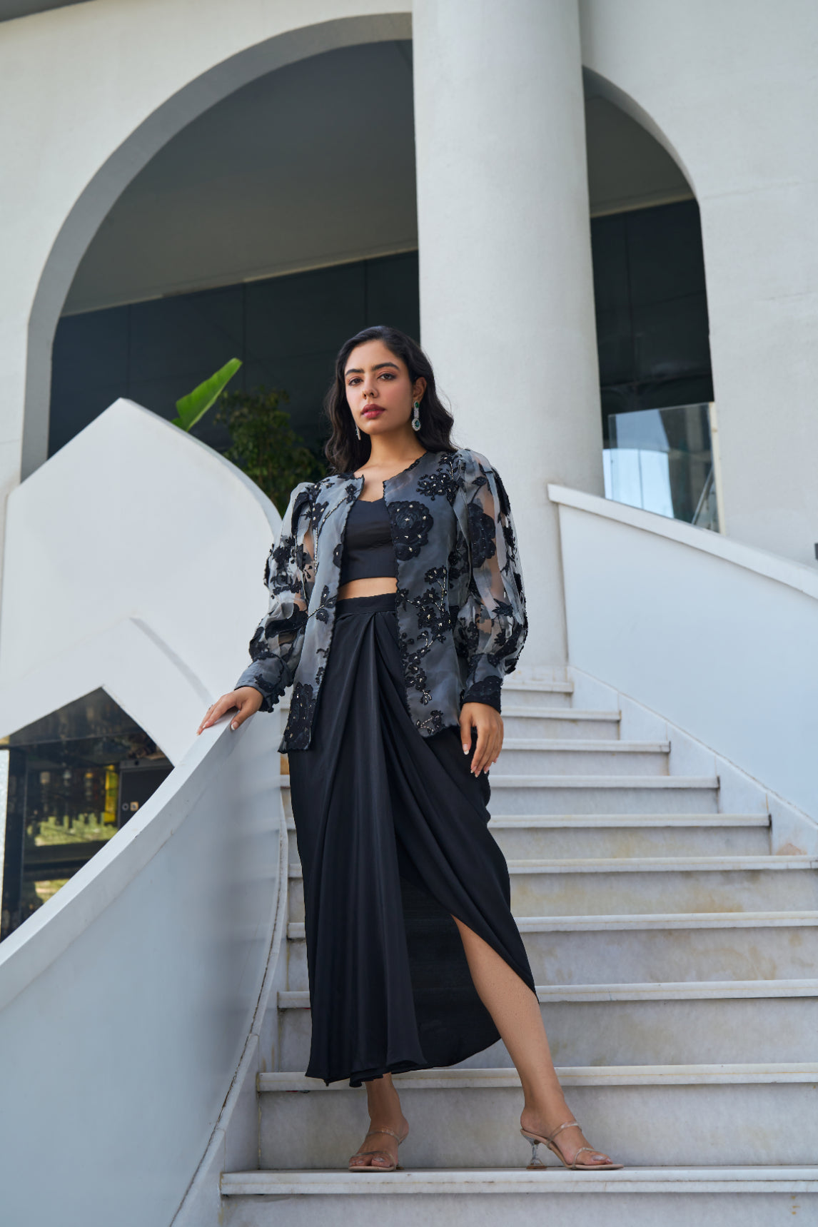 Floral embossed and embroidered soft organza jacket paired with a crepe bustier and Draped Skirt.