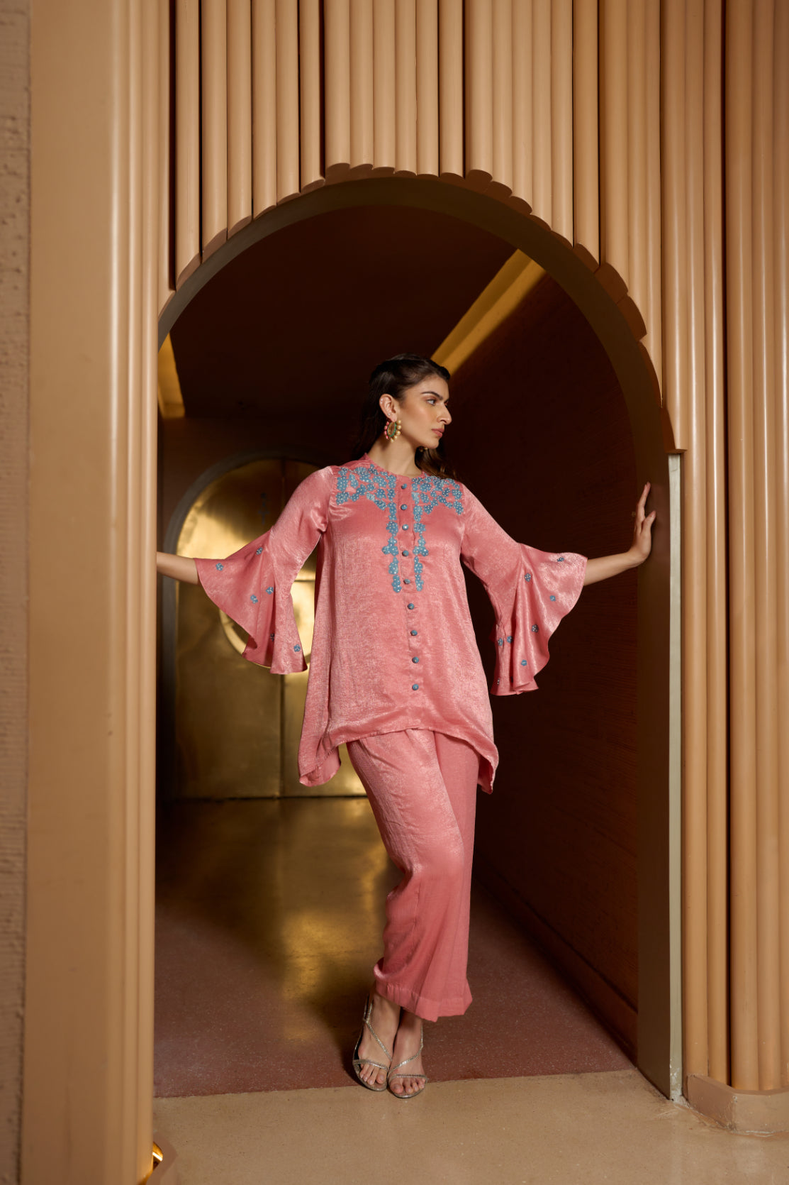 Pink Satin blend Tunic and straight fit pants Embroidered set.