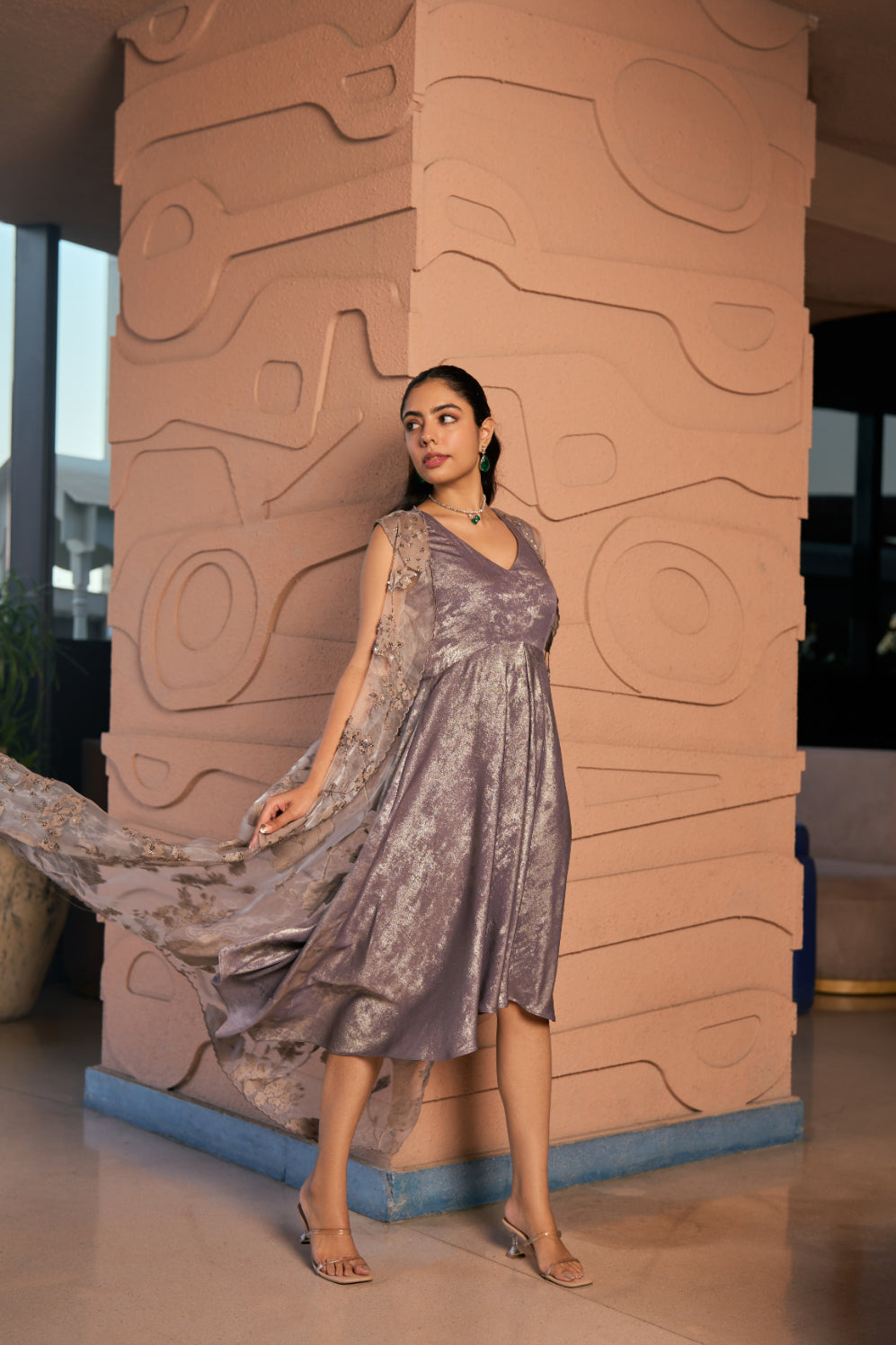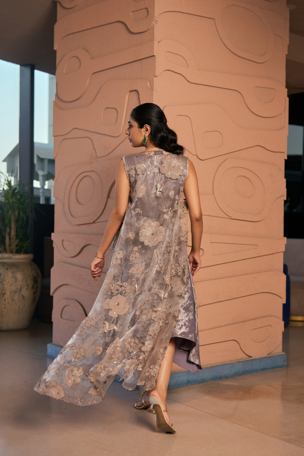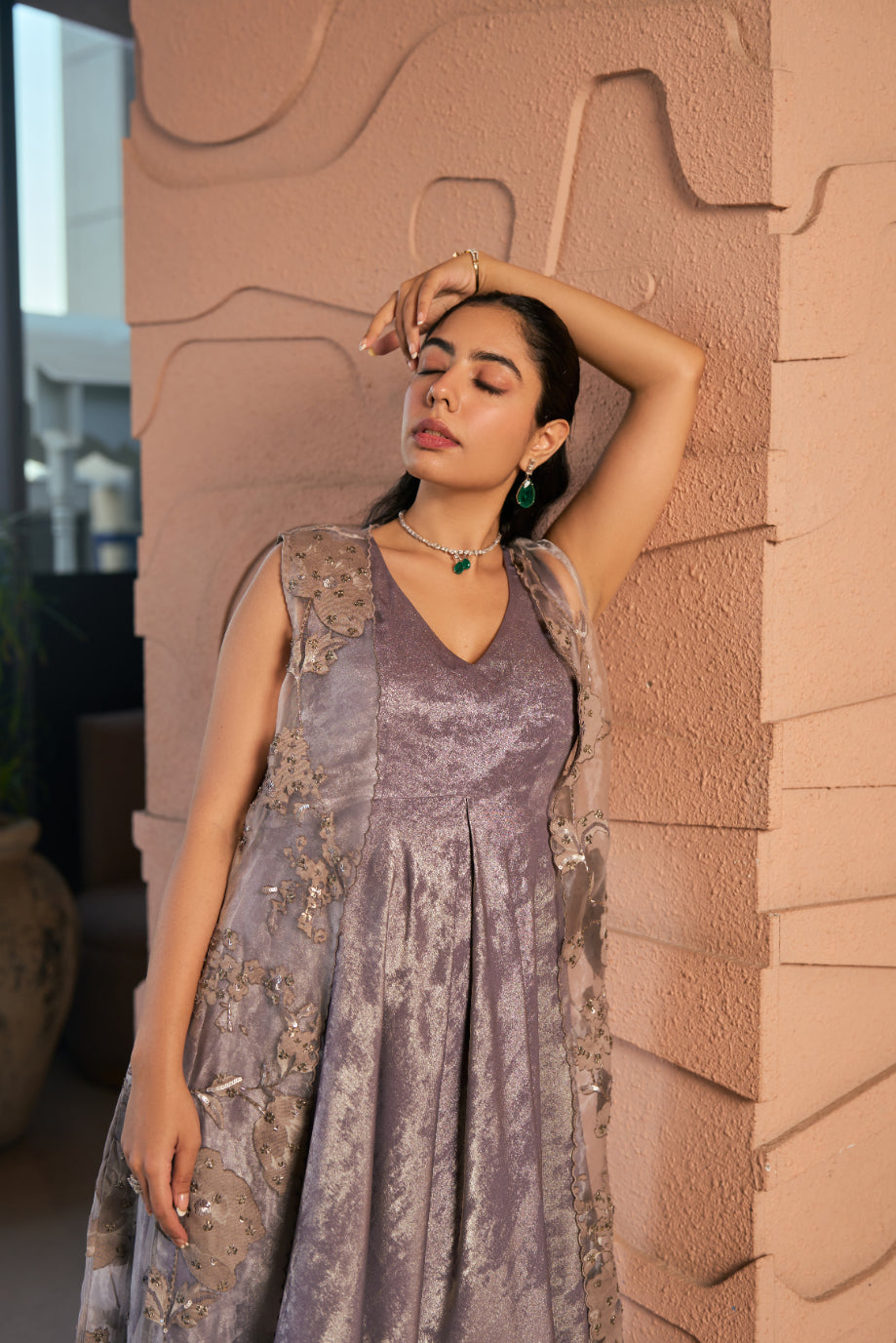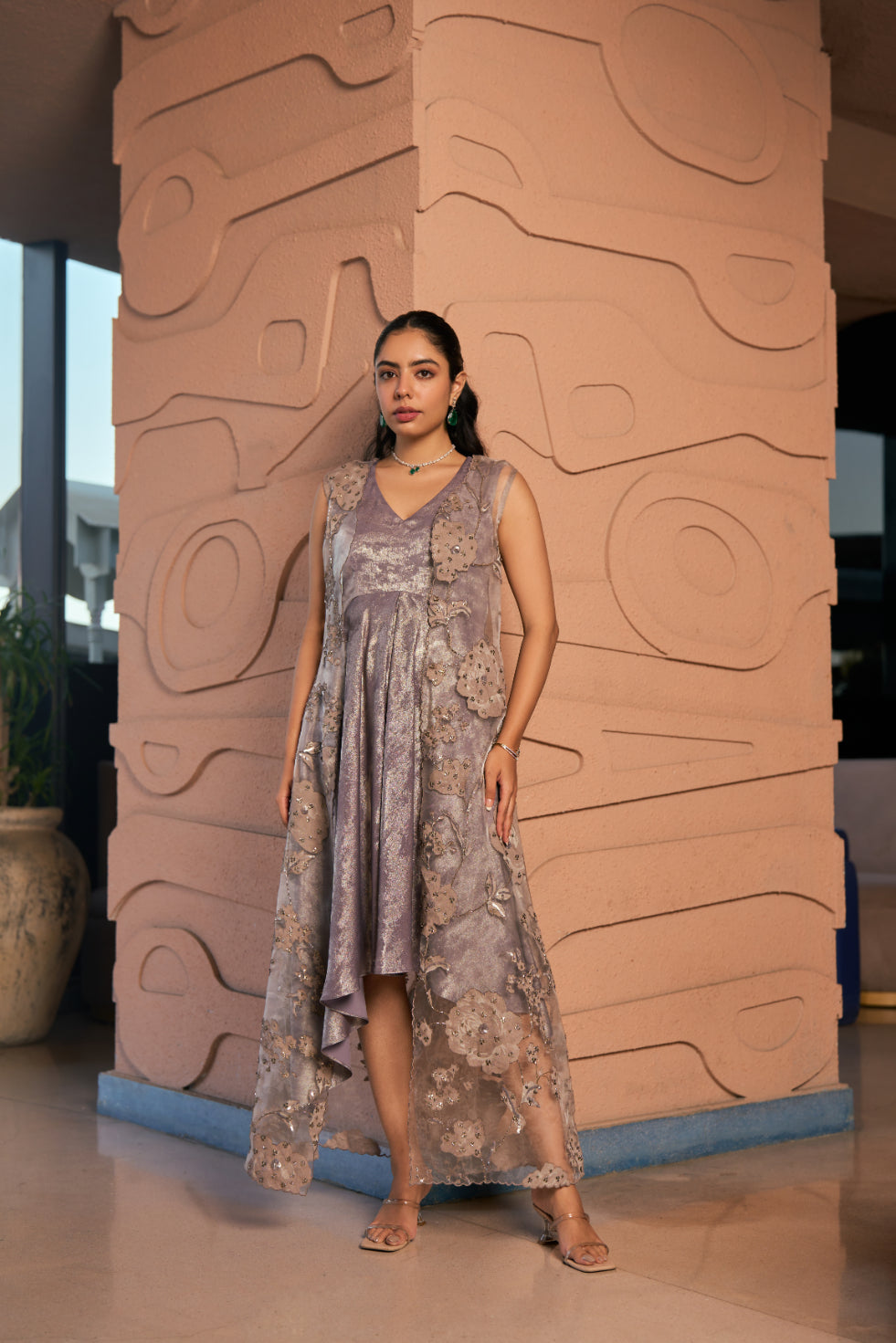 Embossed and Embroidered Floral Soft organza jacket paired with a High low Self-Shimmer crepe blend Dress.