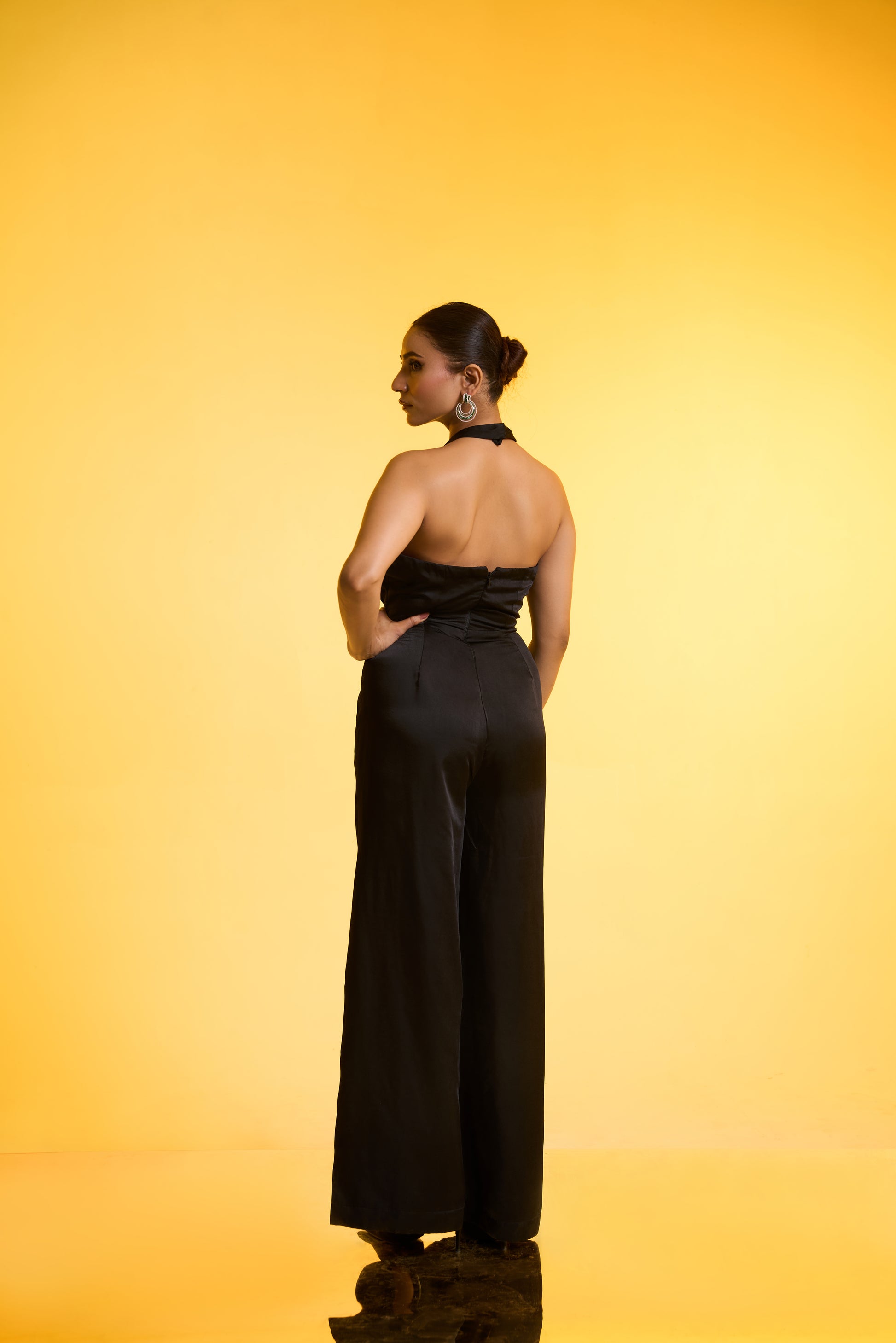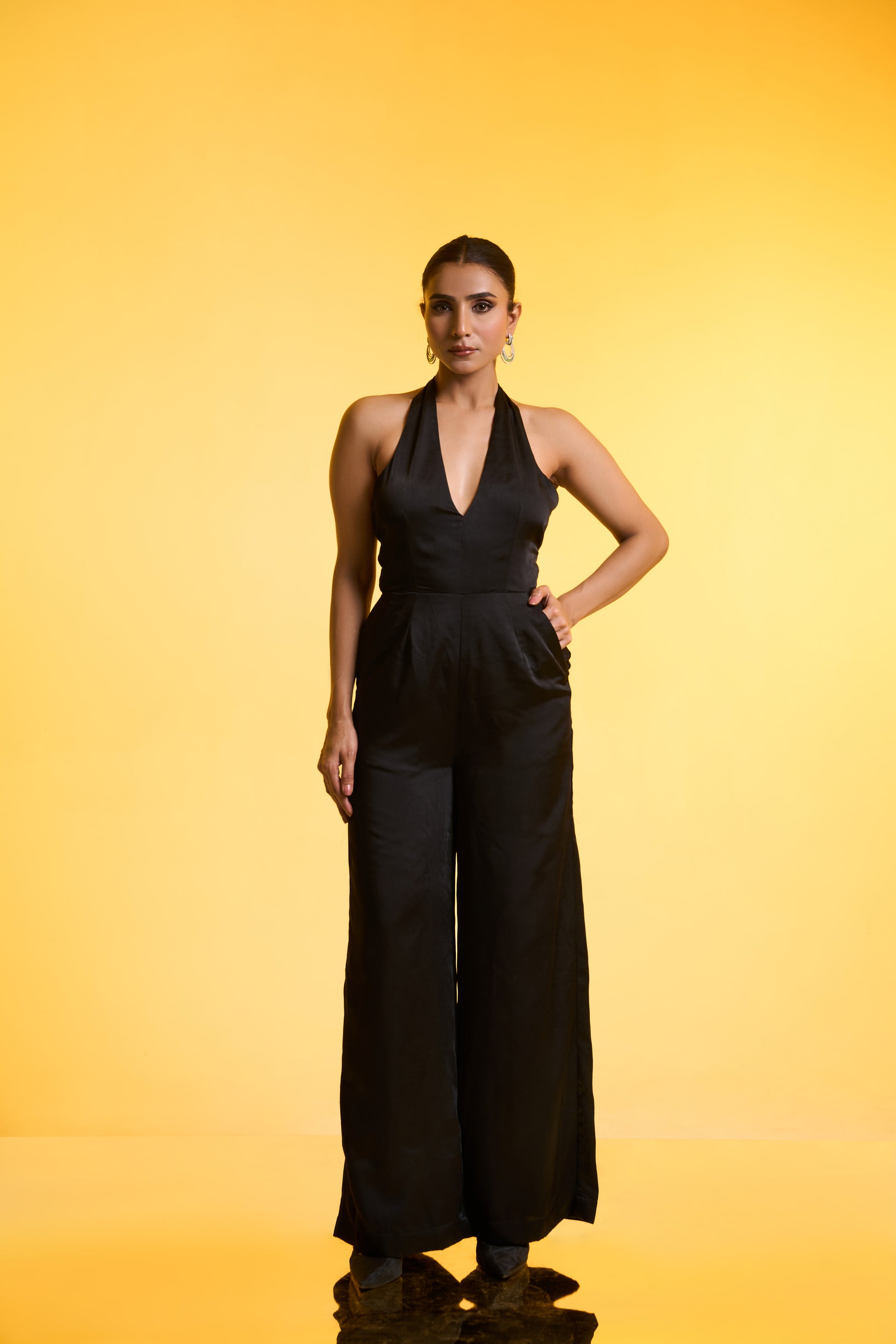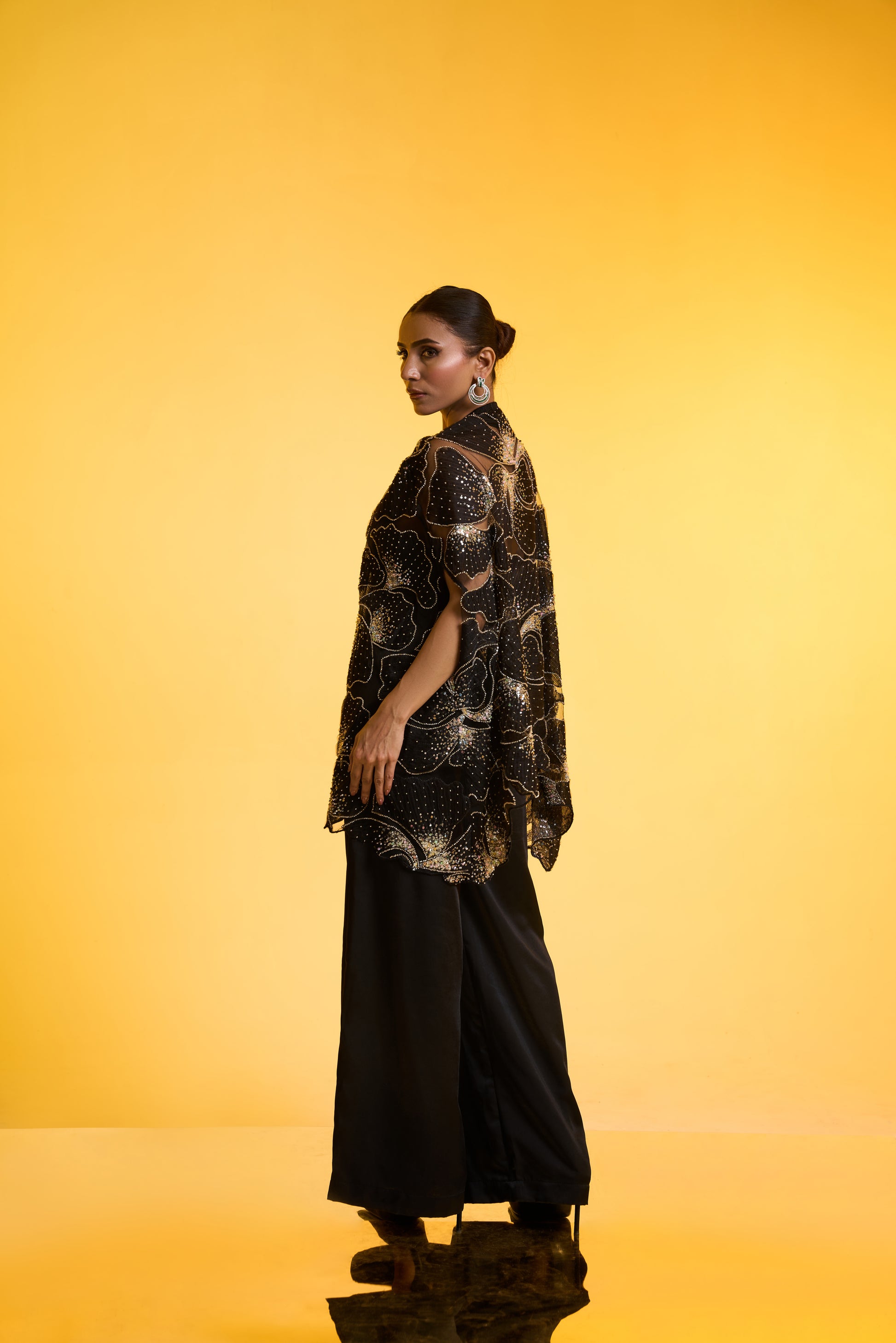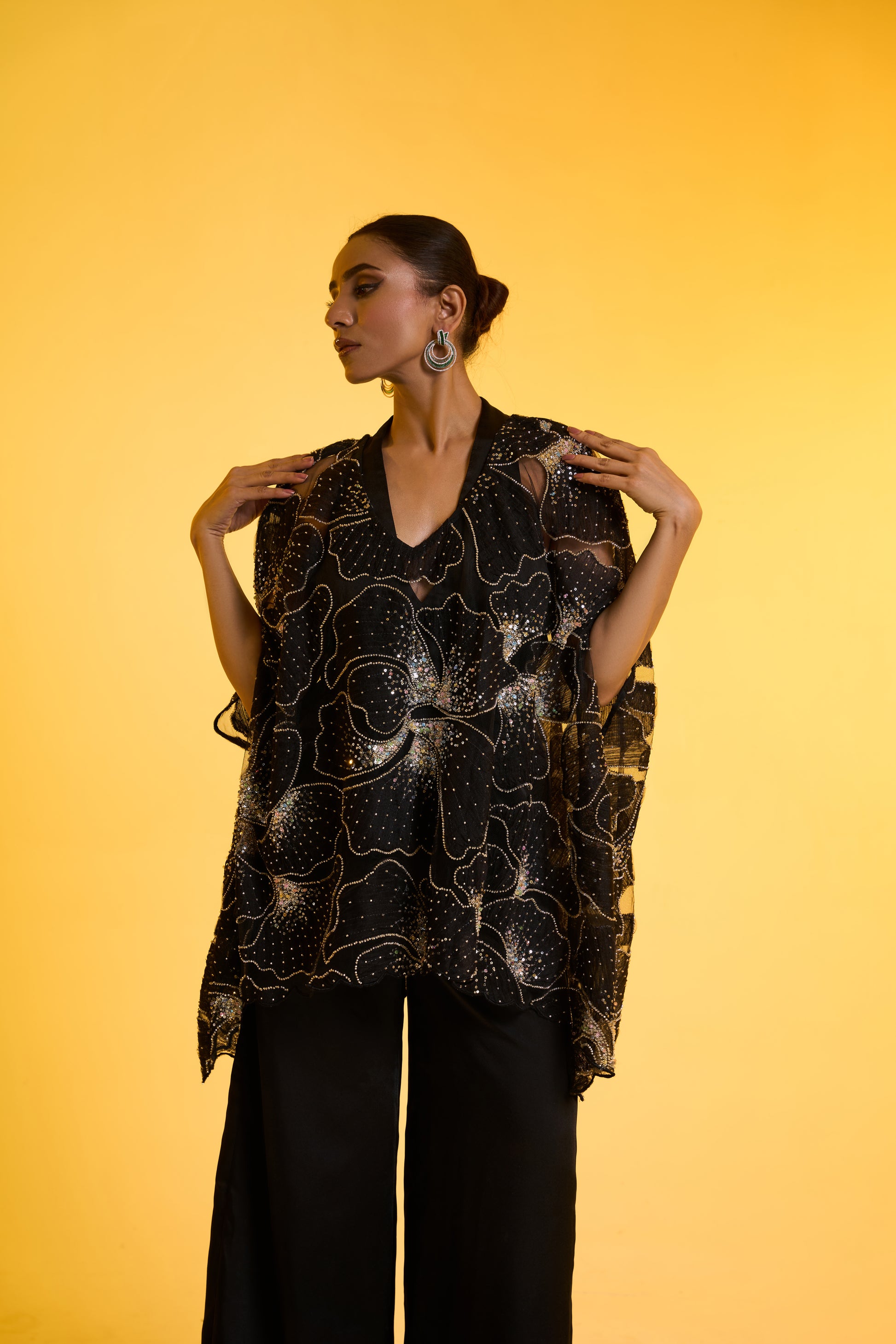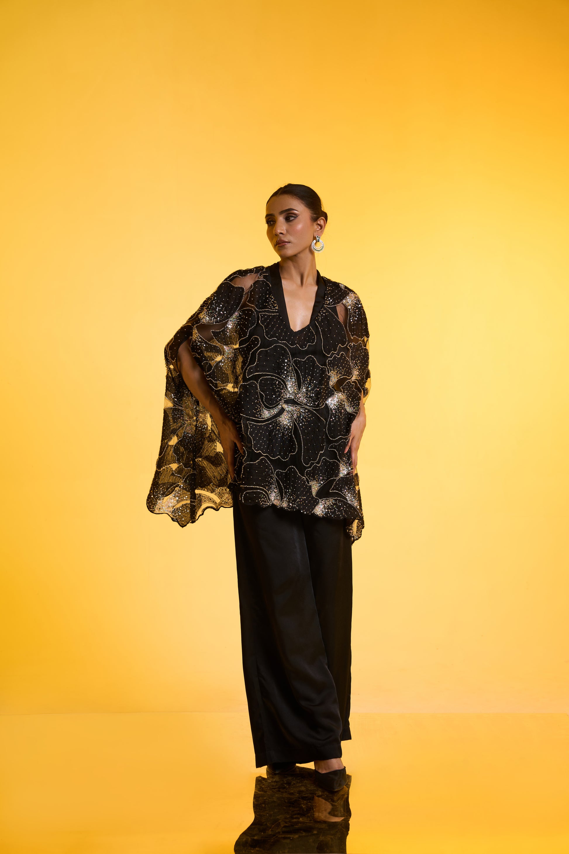 Cape with Jumpsuit Set: A free-size black cape showcases front panel sleeve cuts and exquisite hand embroidery in silver tones, accented with delicate hints of colour. Layered over a black halter-neck jumpsuit with flared pants, the look offers fluid movement and universally flattering appeal—perfect for Parties/ Evening festivities.