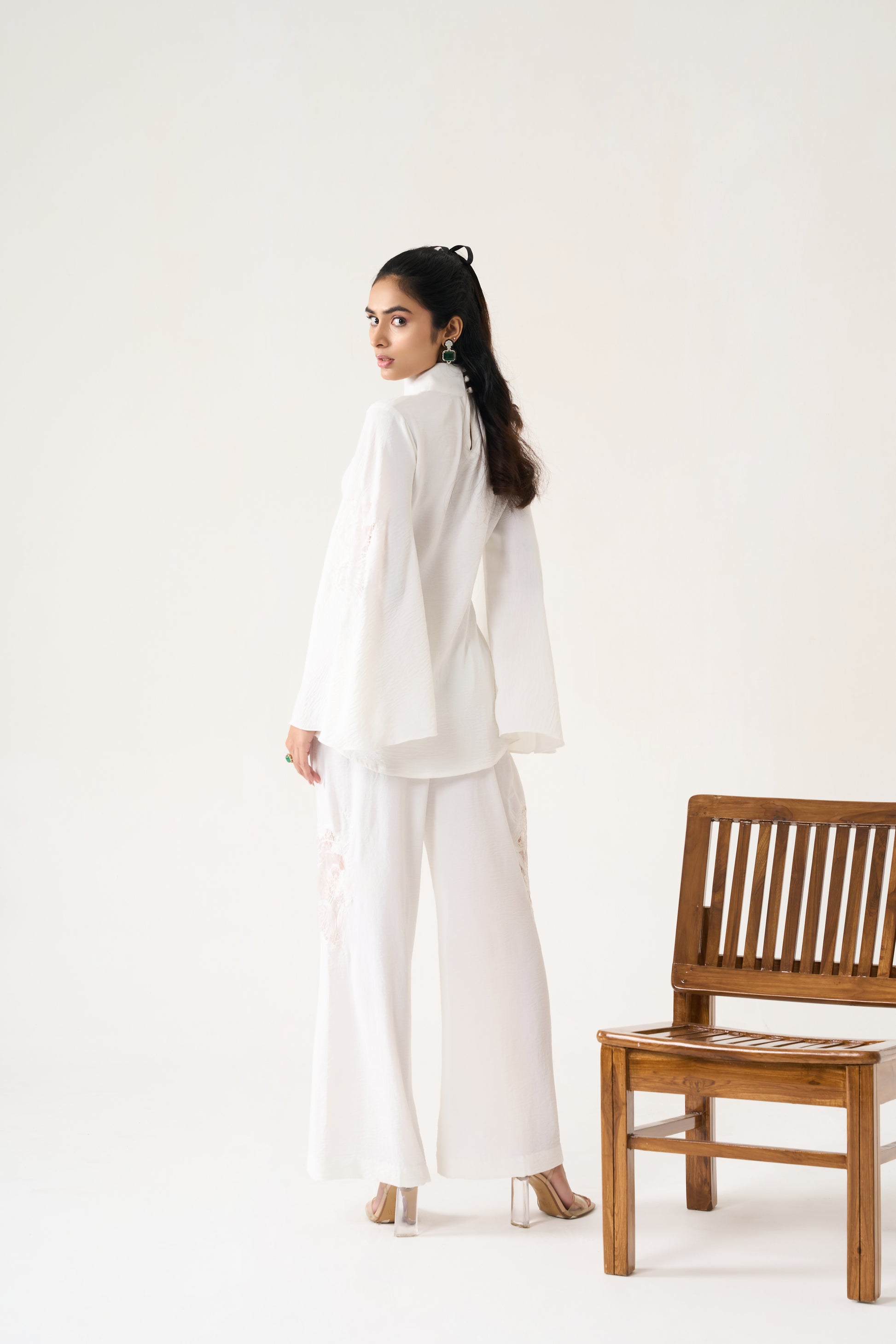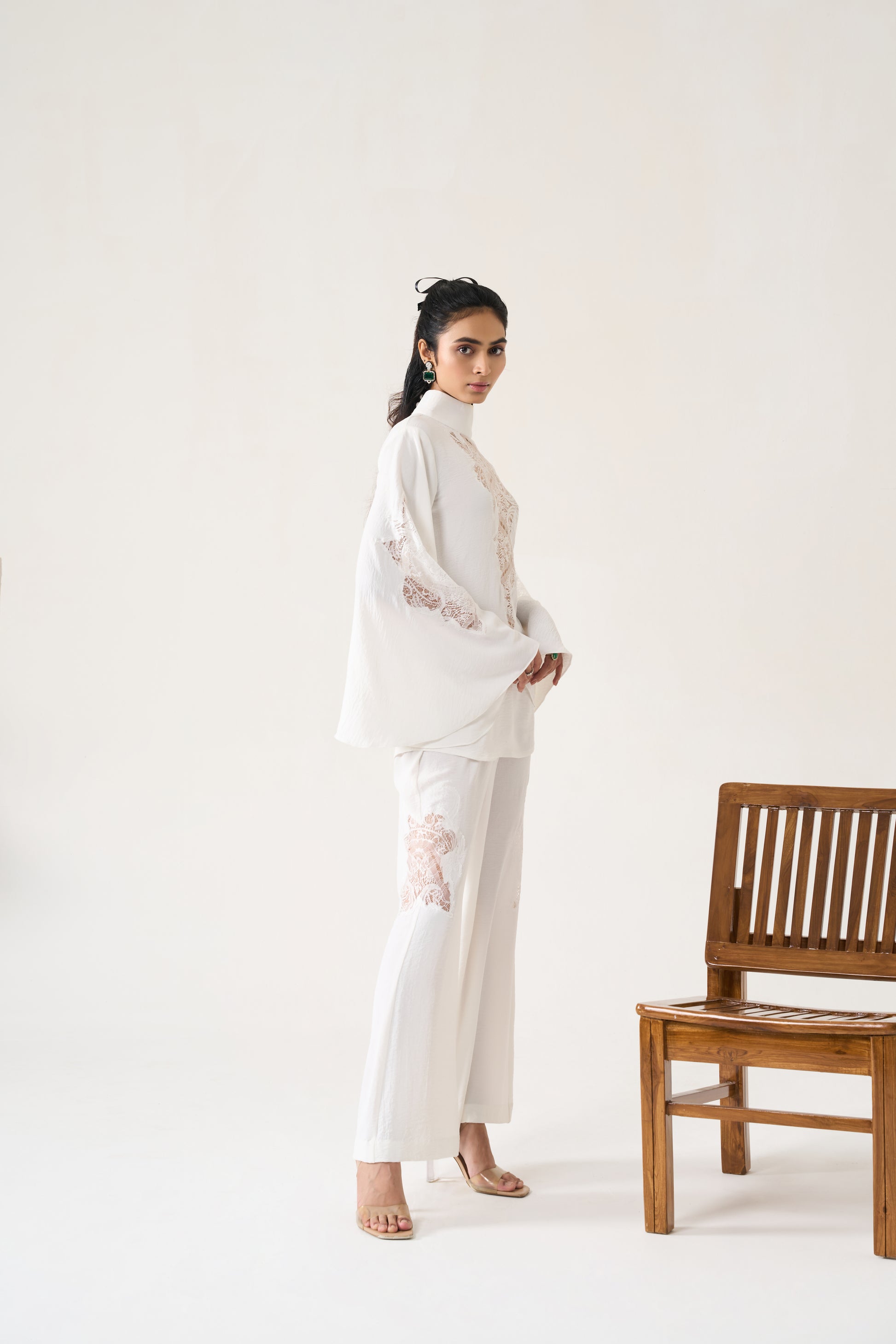 A sophisticated white mid high-neck blouse with elegantly flared sleeves and thoughtfully placed lace accents on the front, paired with straight-fit trousers featuring lace detailing on the thighs—perfectly balancing modern tailoring with delicate femininity.