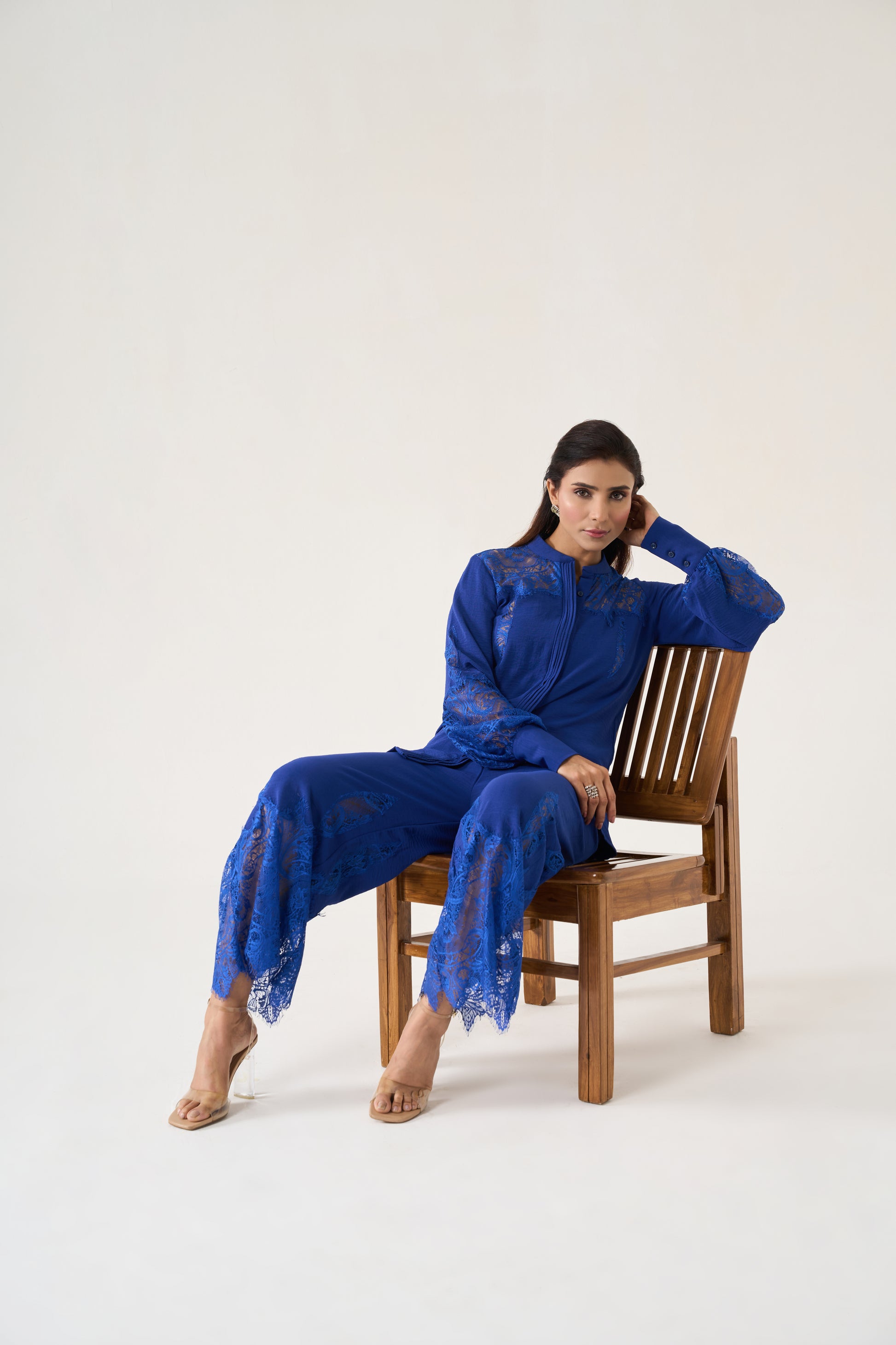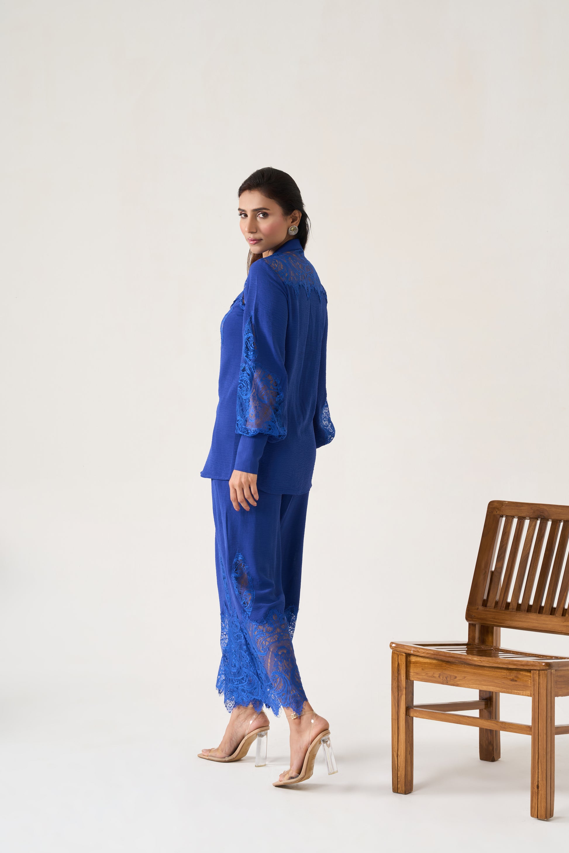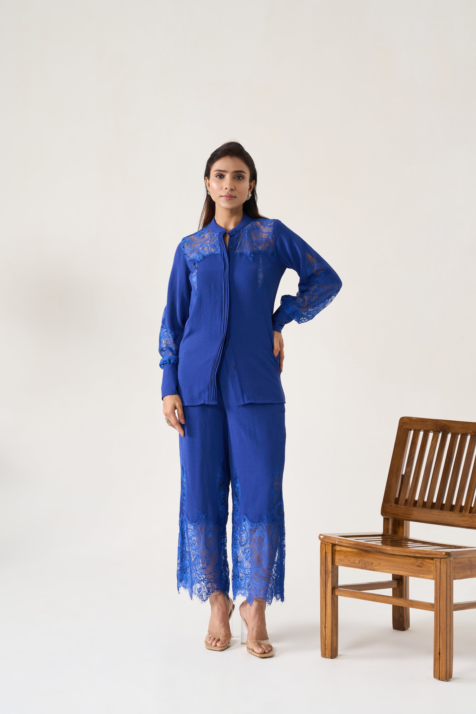An Indigo Blue sleek Chinese-collar buttoned blouse with full sleeves and structured cuffs, paired with flared trousers both embellished with intricate lace appliqué for a polished, modern look.