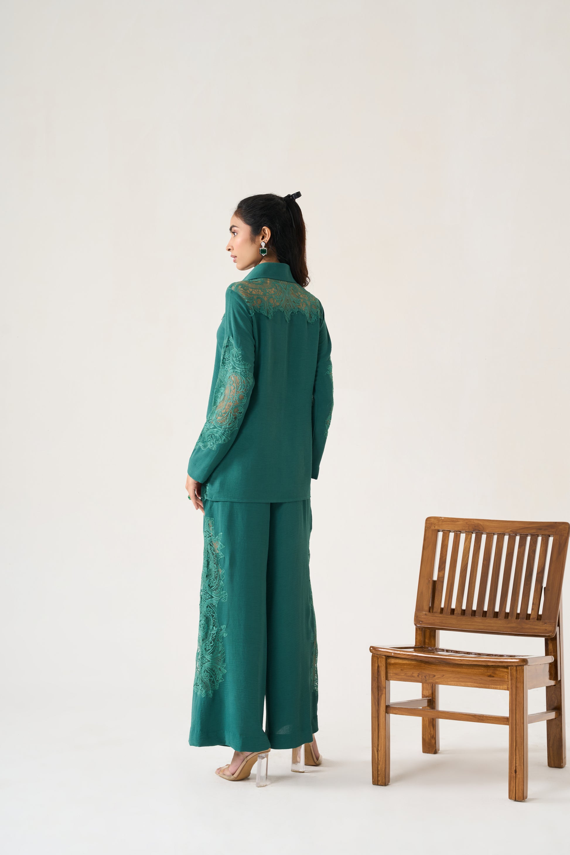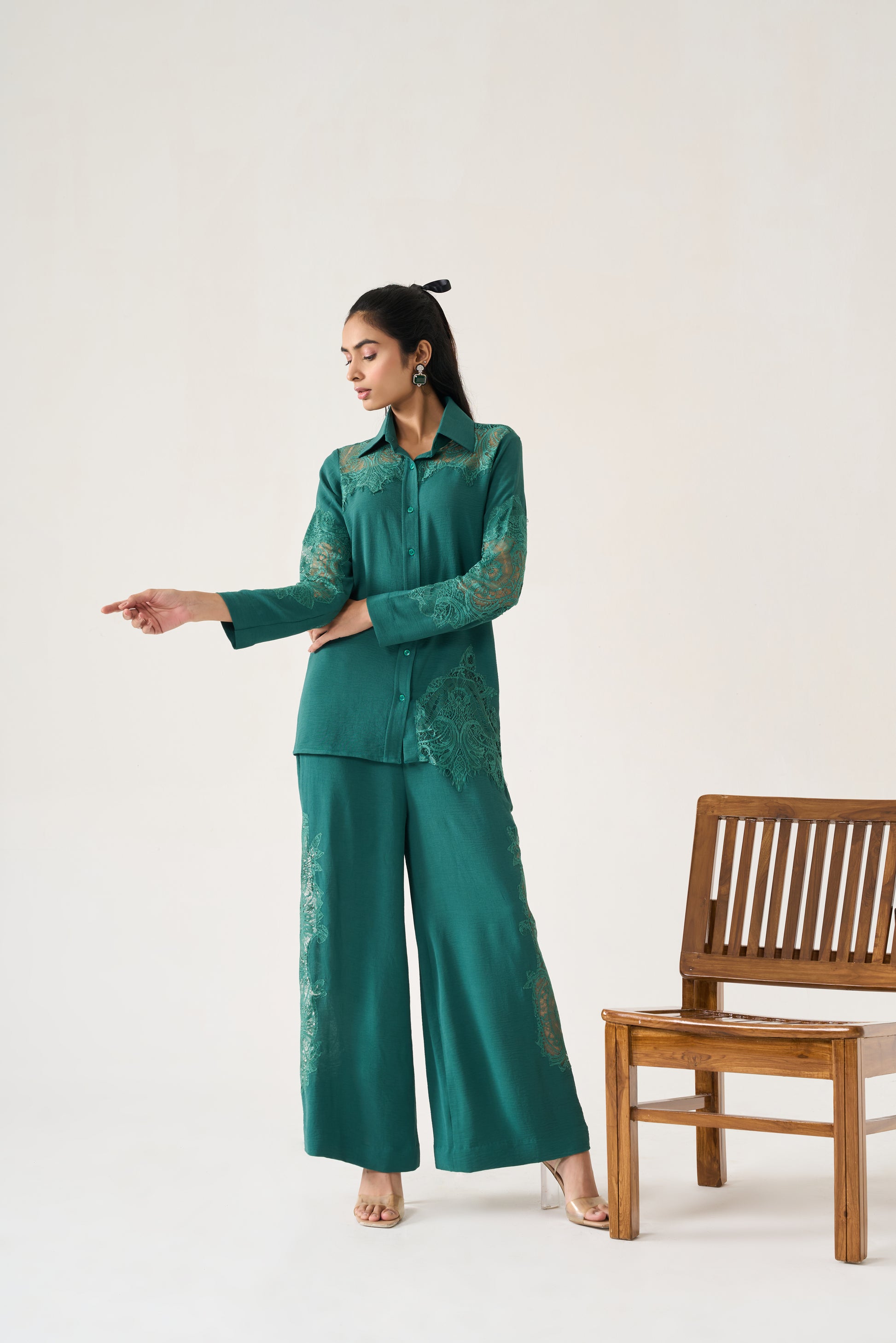 A chic green collared blouse with full sleeves adorned with intricate appliqué lace, paired with flared pants featuring matching lace detailing along both sides—an effortlessly elegant ensemble that blends classic tailoring with delicate feminine touches.