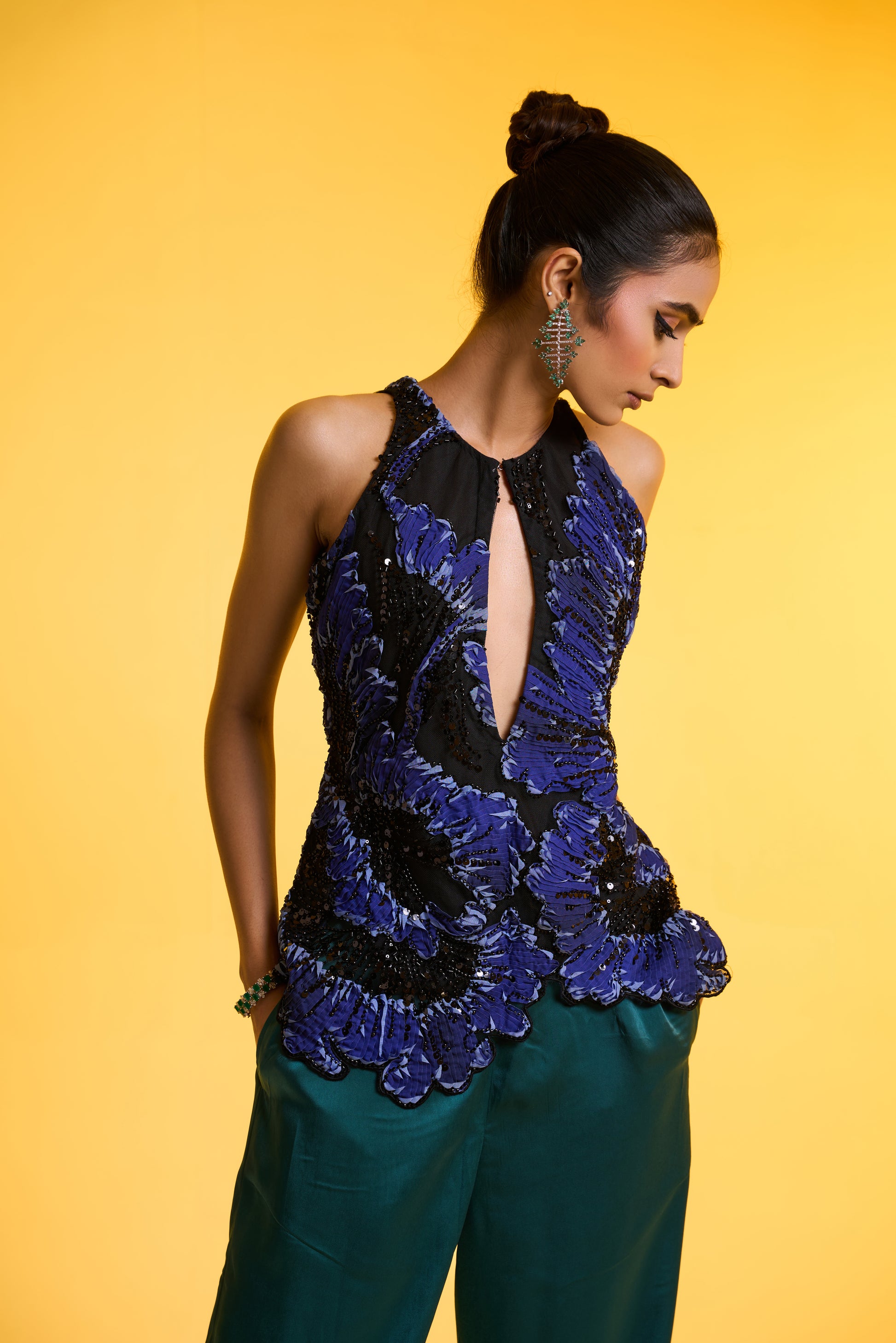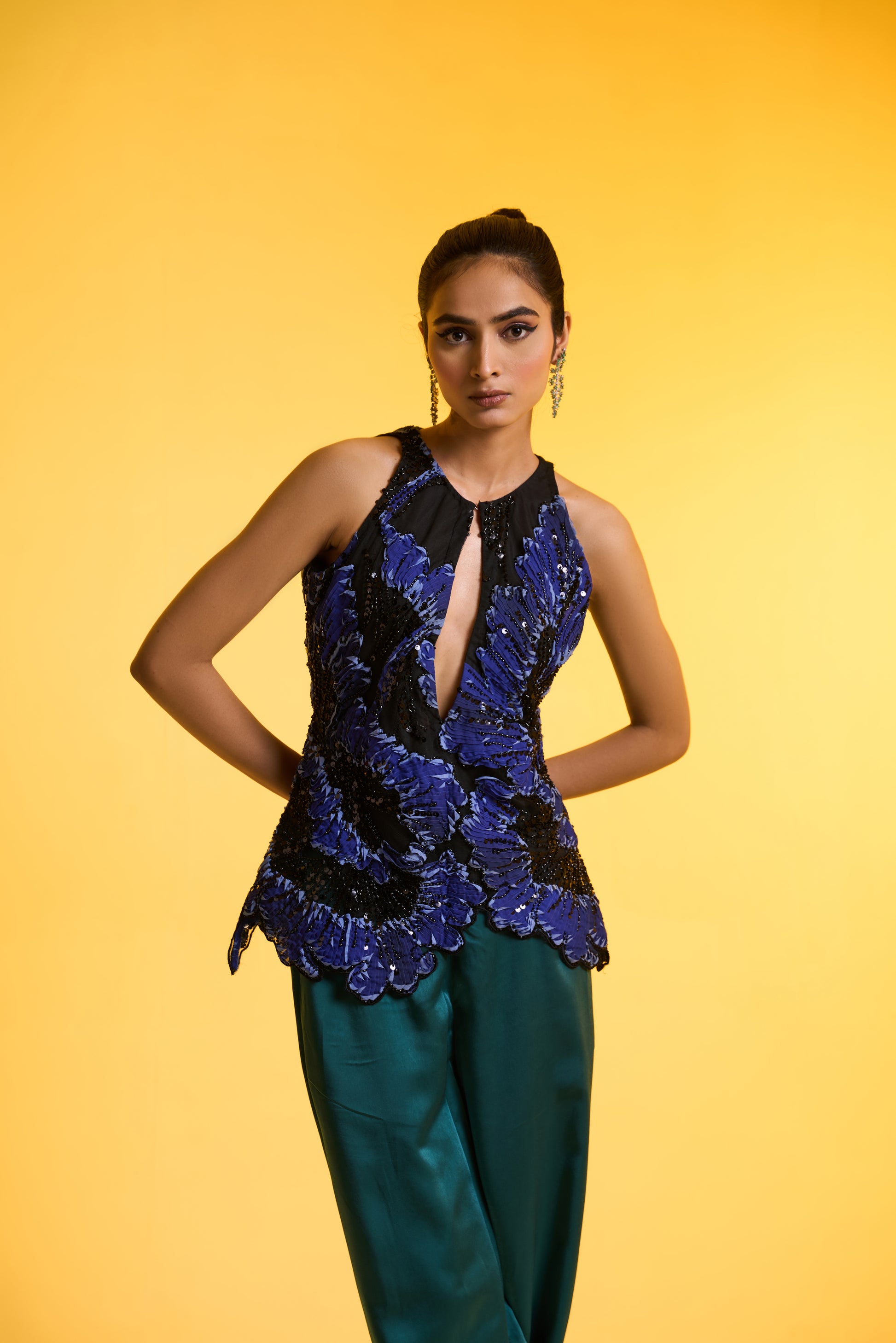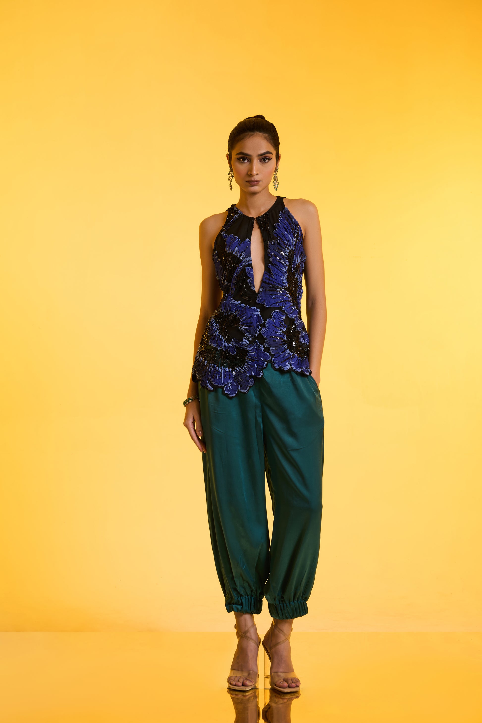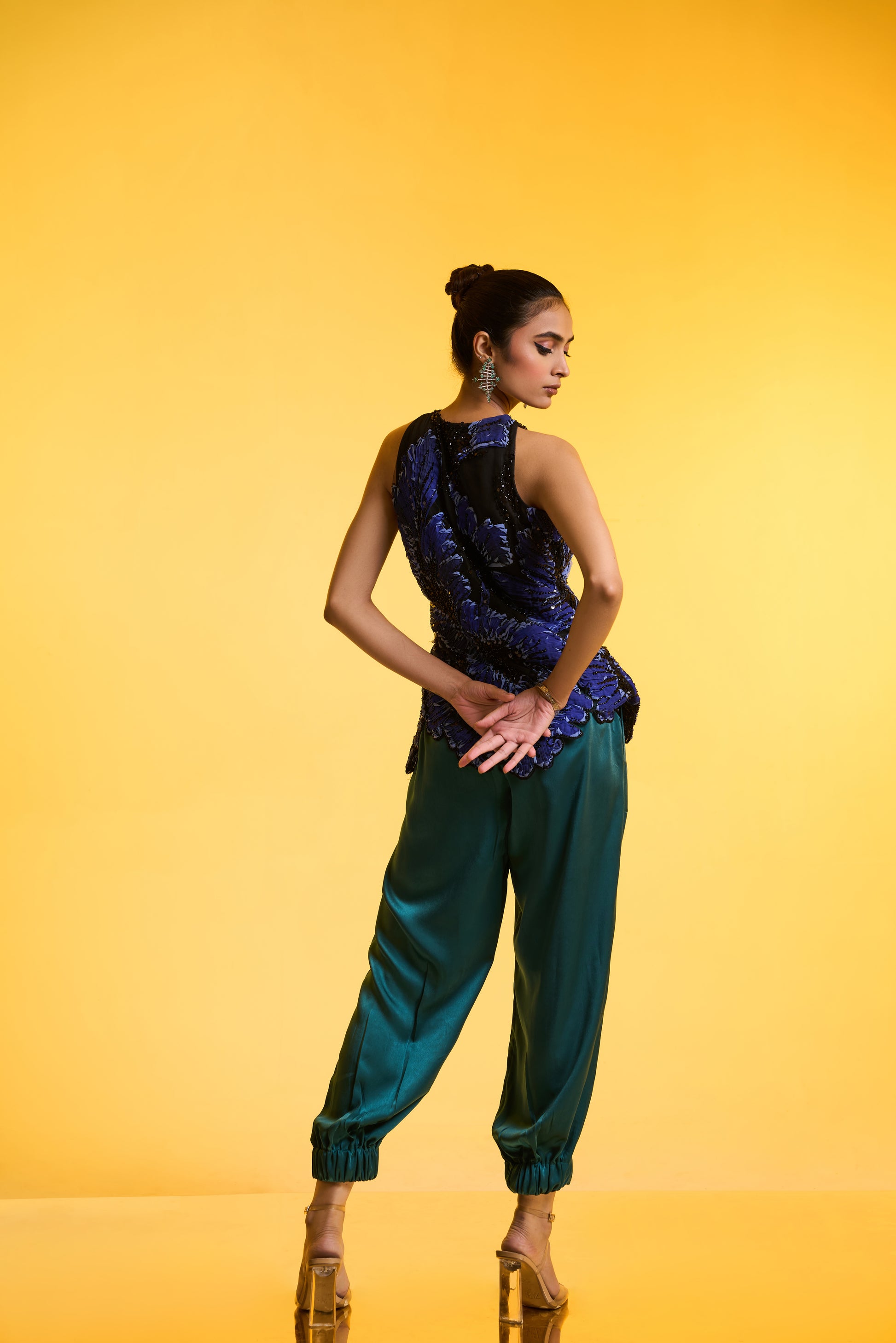 Blouse -Pant Set: A vibrant dark blue net blouse, intricately detailed with black textured embroidery, is complemented by tailored balloon-fit green trousers. Designed for modern sophistication, the ensemble balances statement detailing with structured ease. Turn heads at brunches, lunches, or evening parties alike.