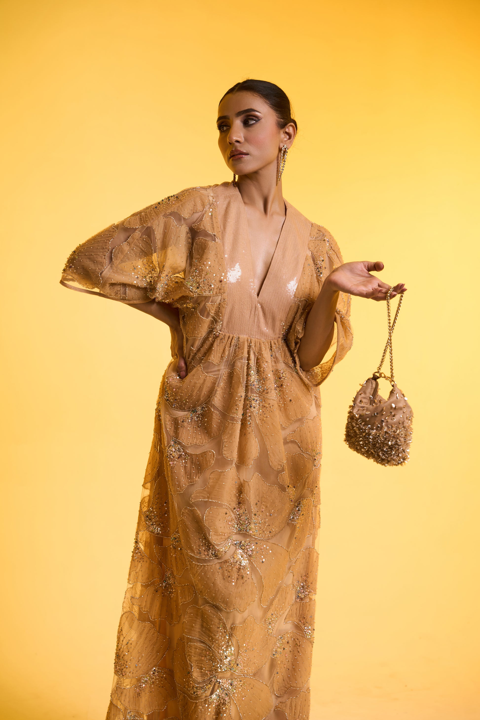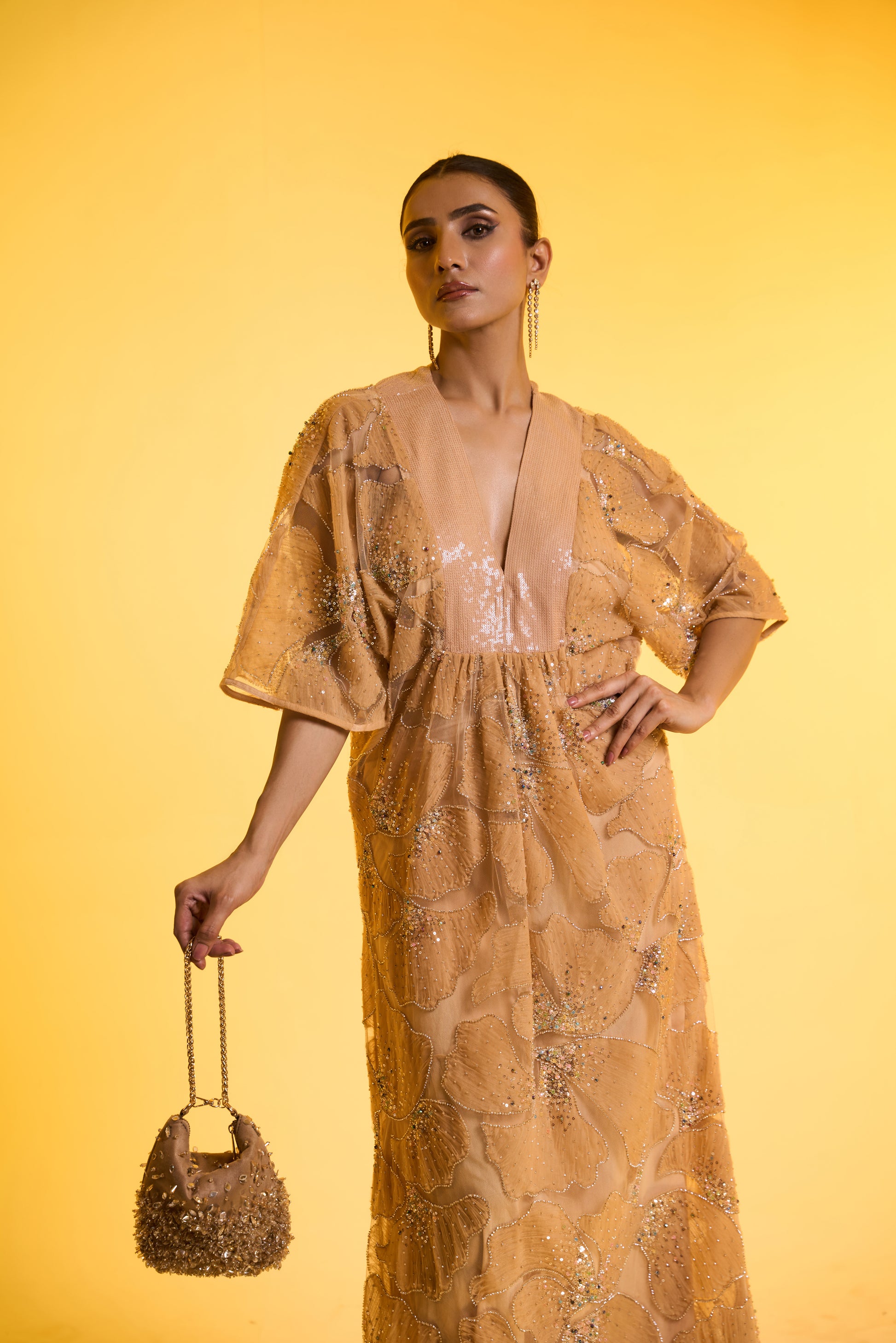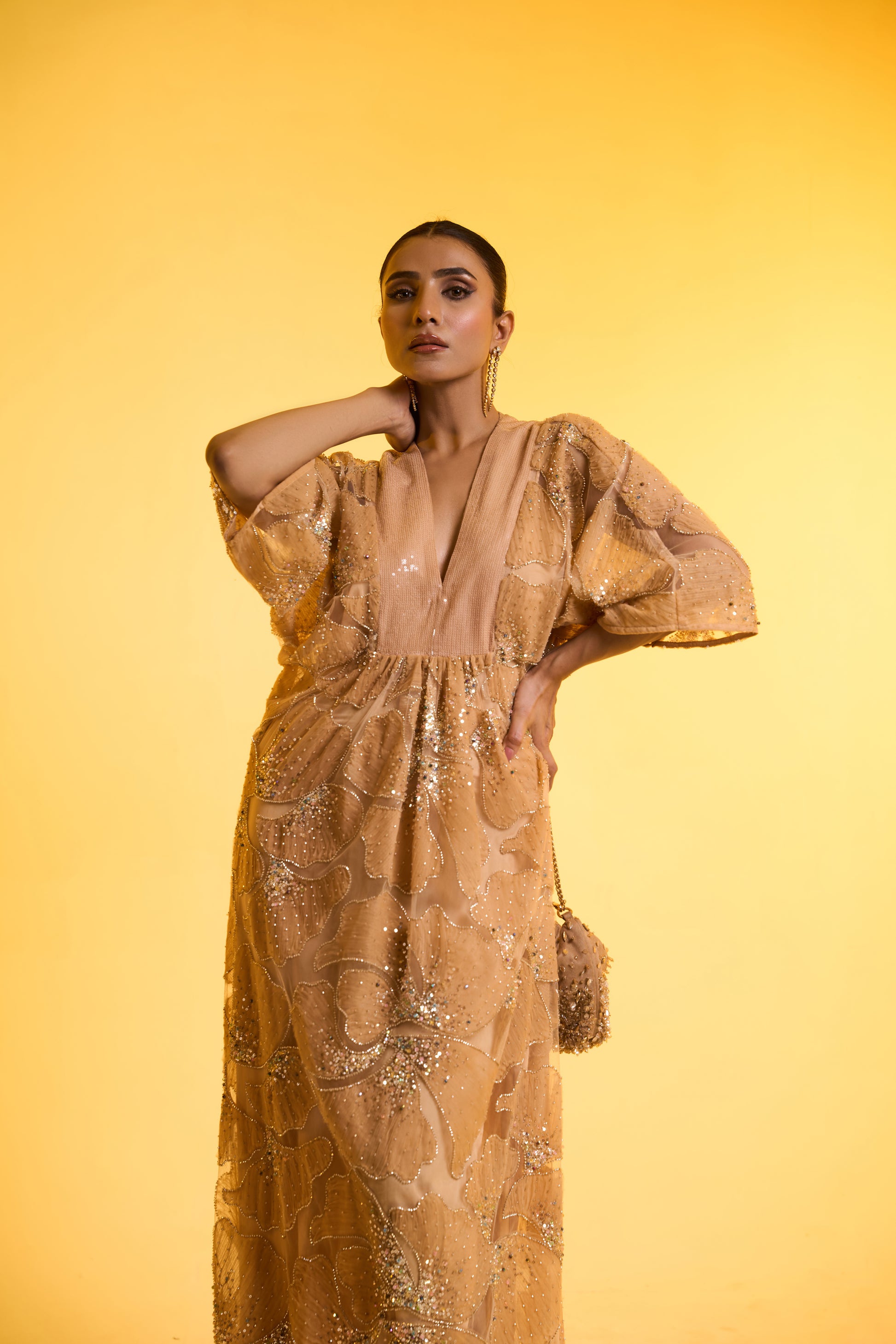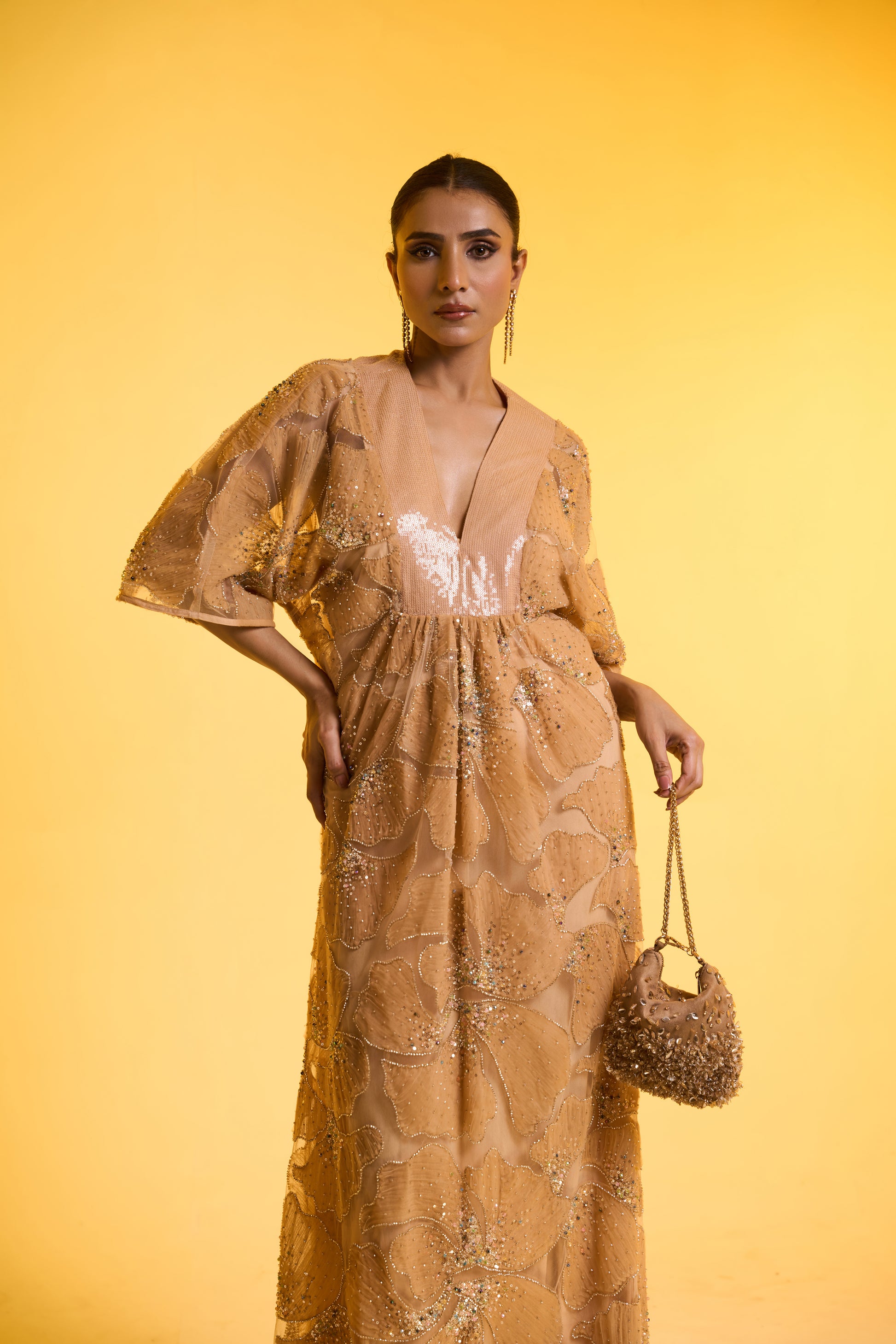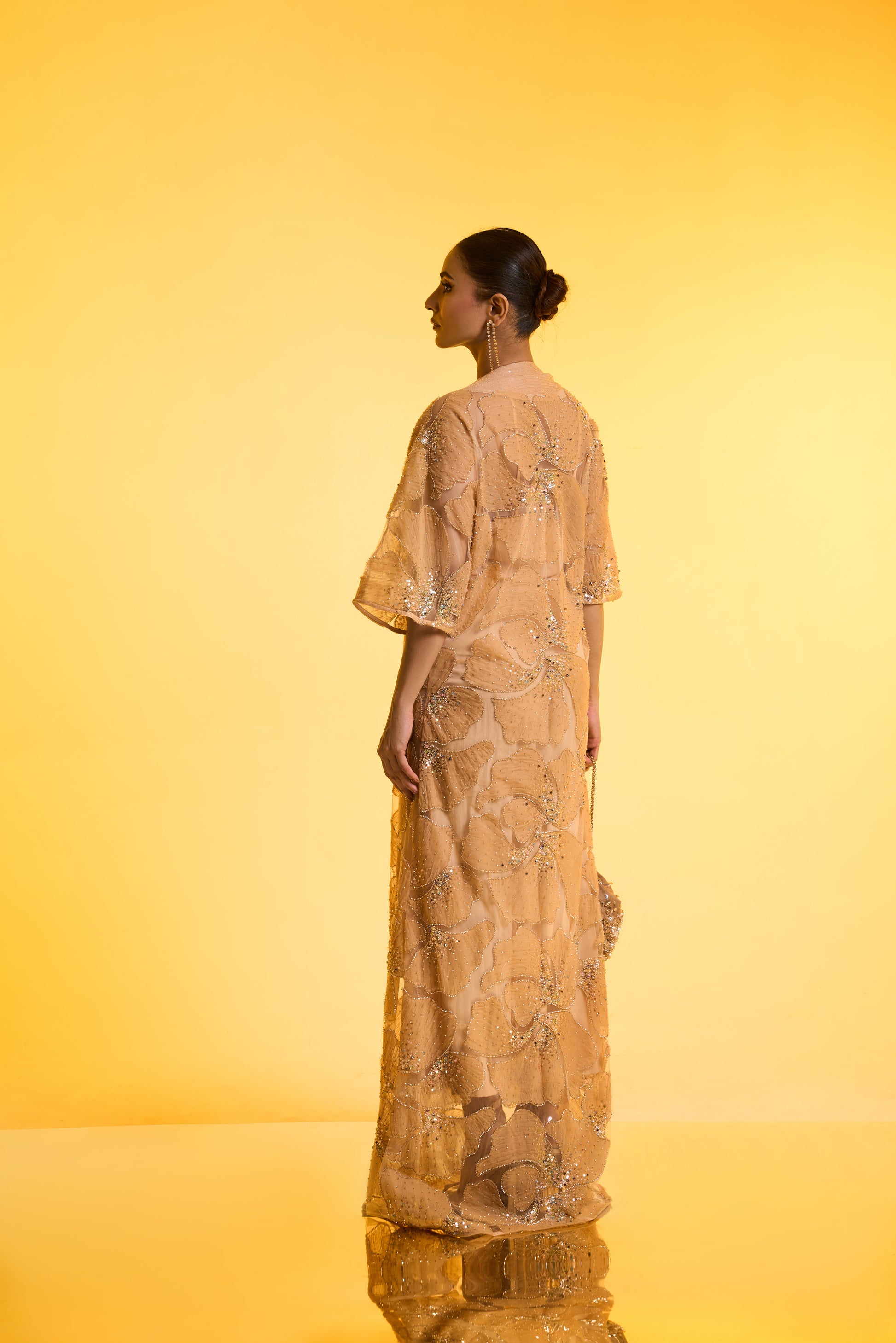 Kaftan With Inner: Crafted in beige and gold net, this elegant kaftan features a soft crepe inner for comfort and fluidity. The front is adorned with shimmering silver, gold, and multi-colour sequin floral embroidery, complemented by self gold sequin detailing along the square neckline. Side slits enhance movement, creating a refined yet statement silhouette. Wear it to make an impression, whether it’s a day function or a night celebration.