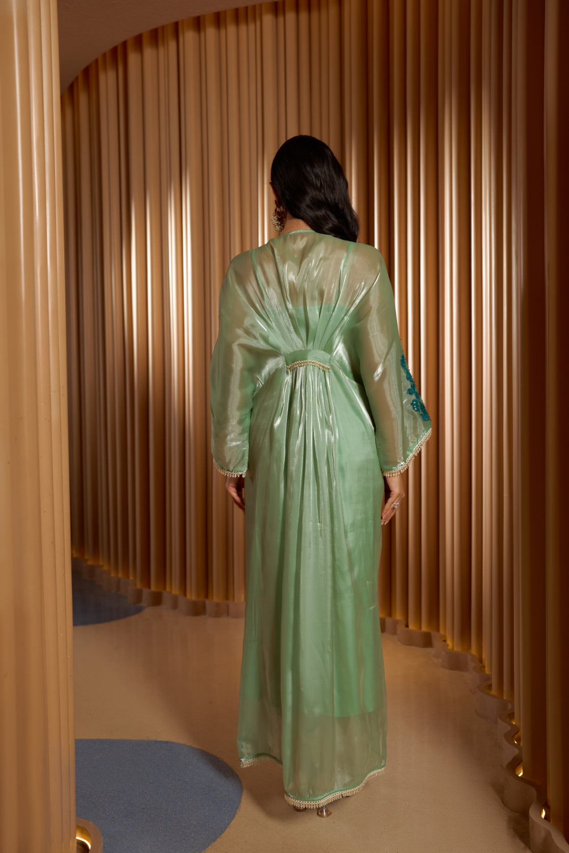 Mint Green embroidered Fluid Orgnaza Kaftan paired with a slip dress inside.