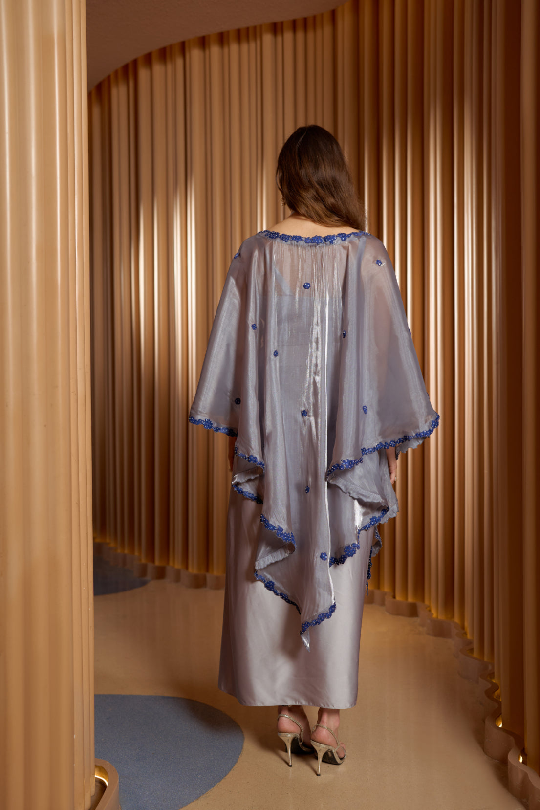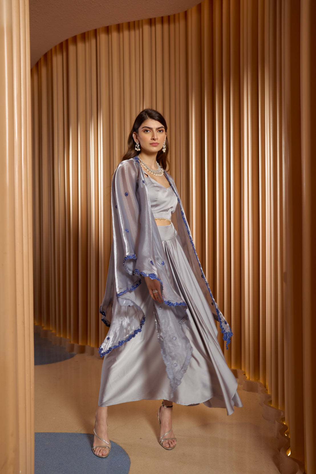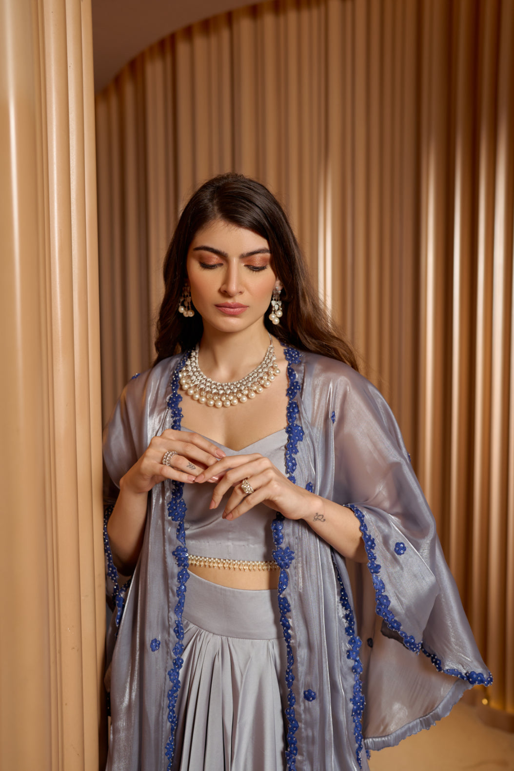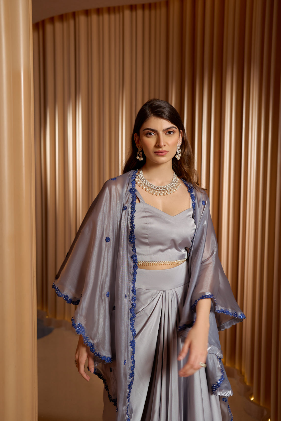 Grey- blue embroidered Fluid organza cape paired with a crepe satin blouse and draped skirt.