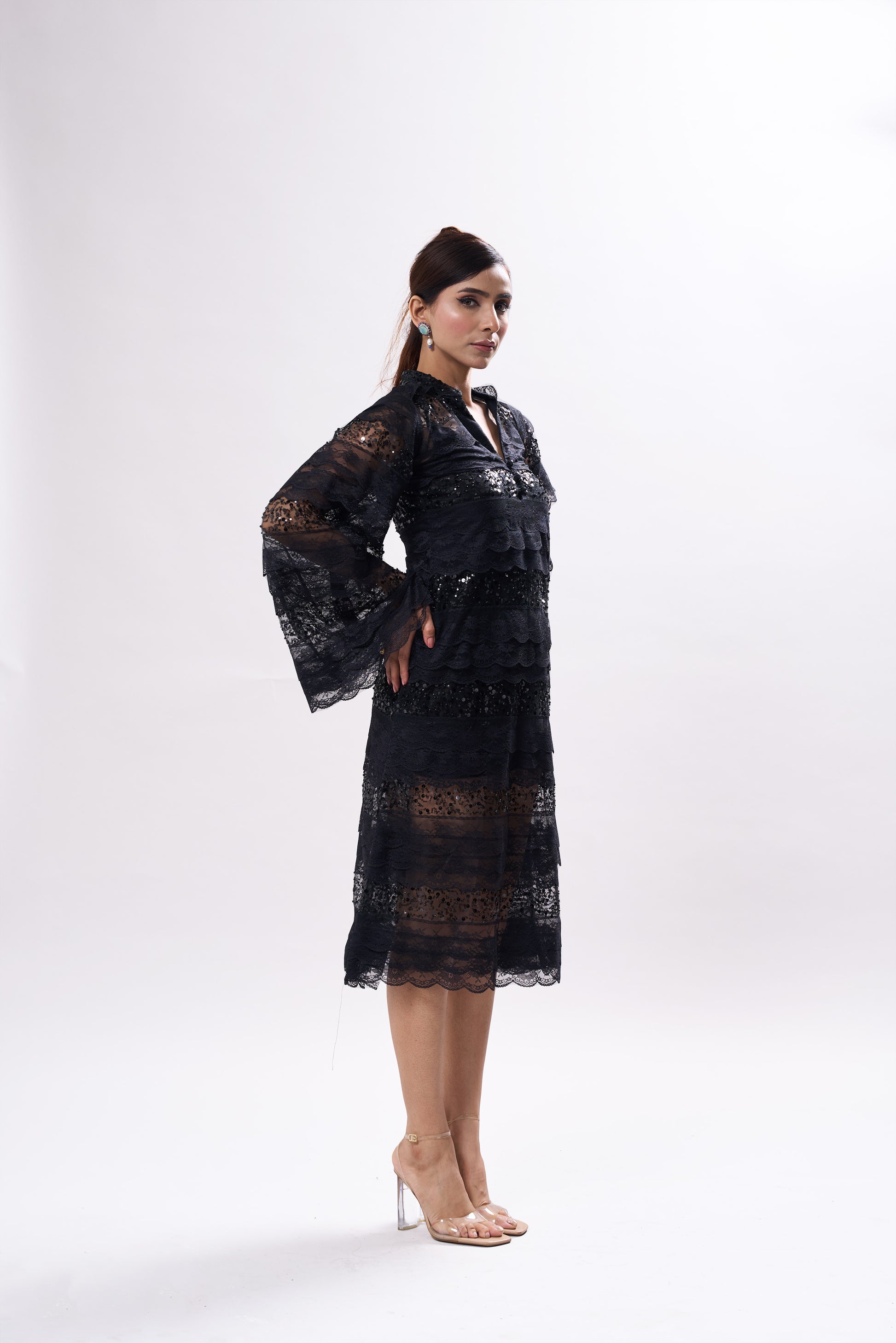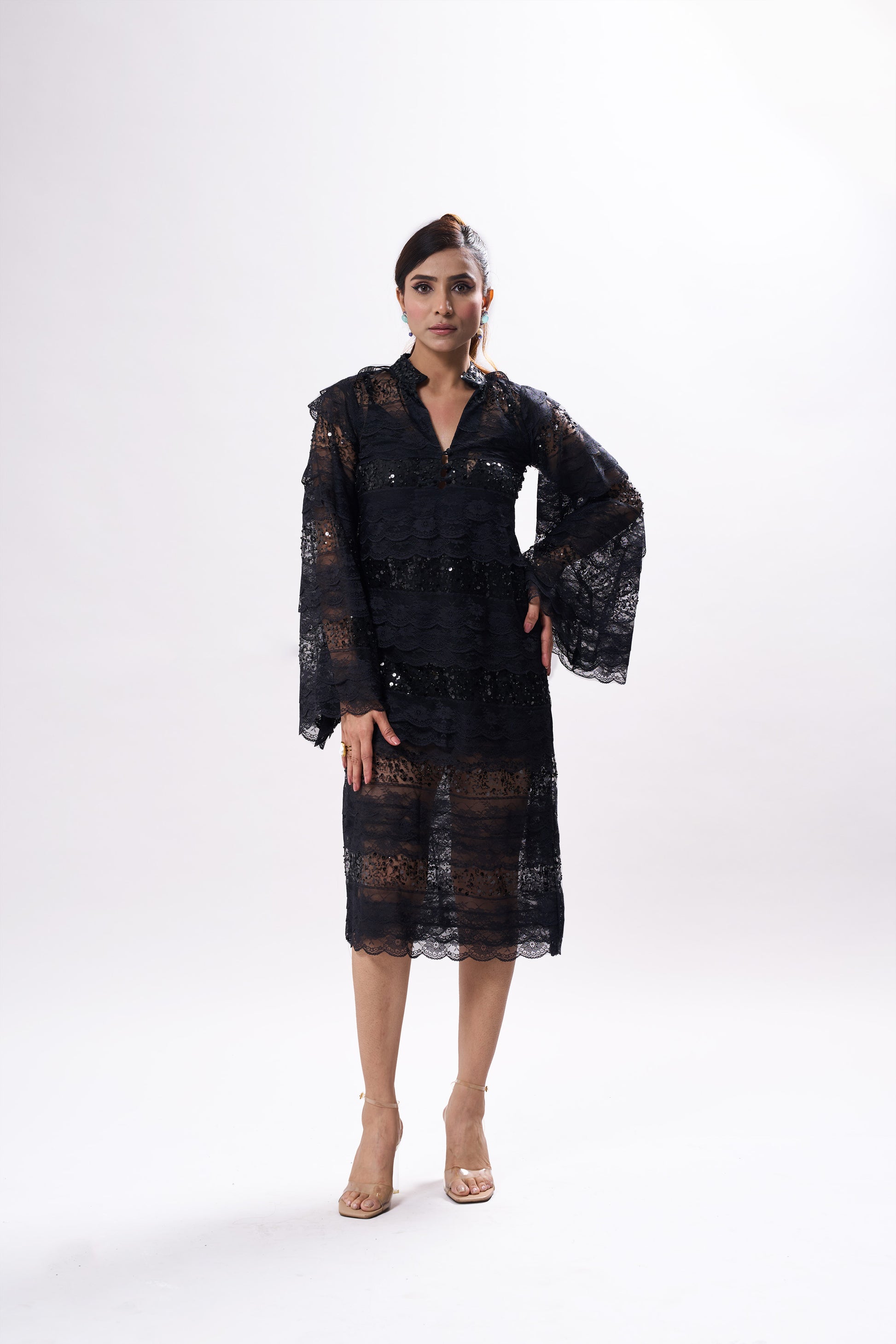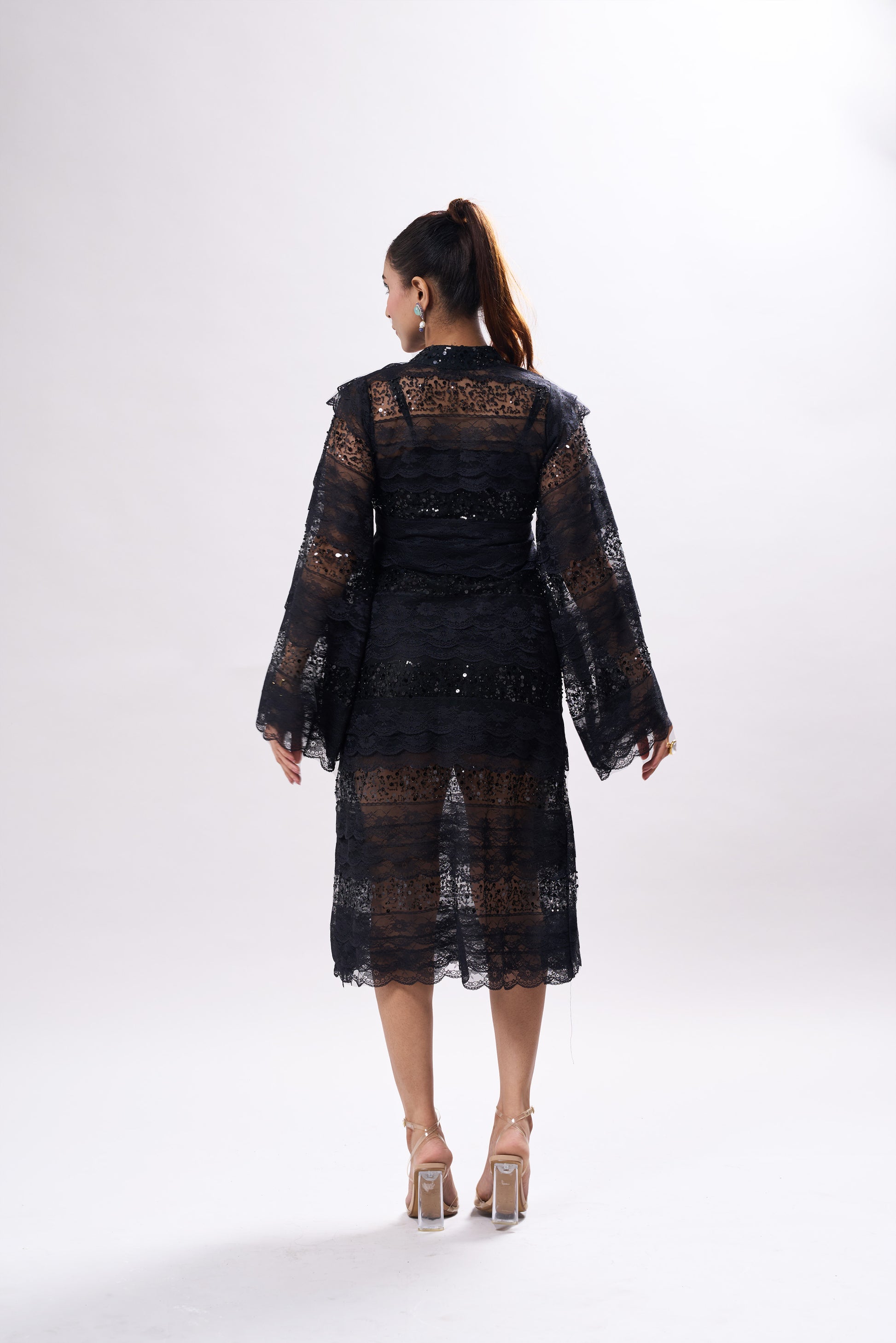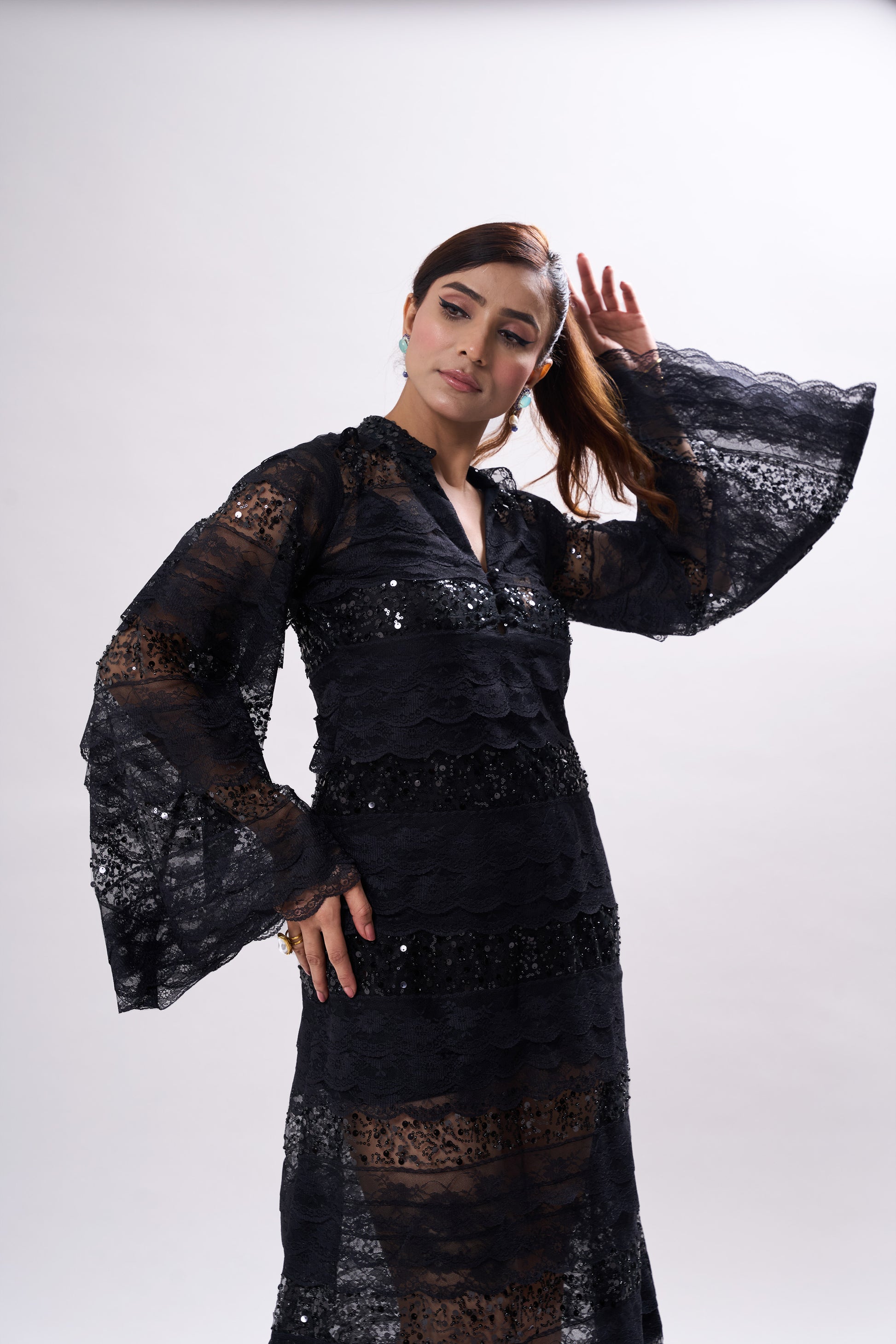 This kaftan-inspired midi dress is designed to move fluidly with the body, its bell sleeves and elongated silhouette creating an effortlessly graceful drape. Crafted from sheer lace fabric intricately embroidered with black sequins, it flatters and complements most body types with its flowing ease.