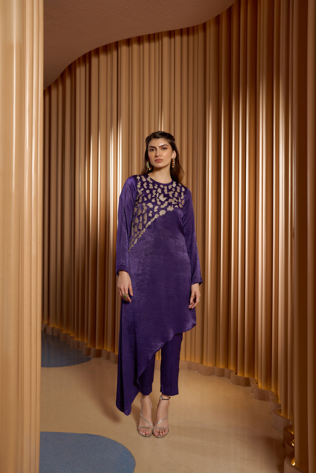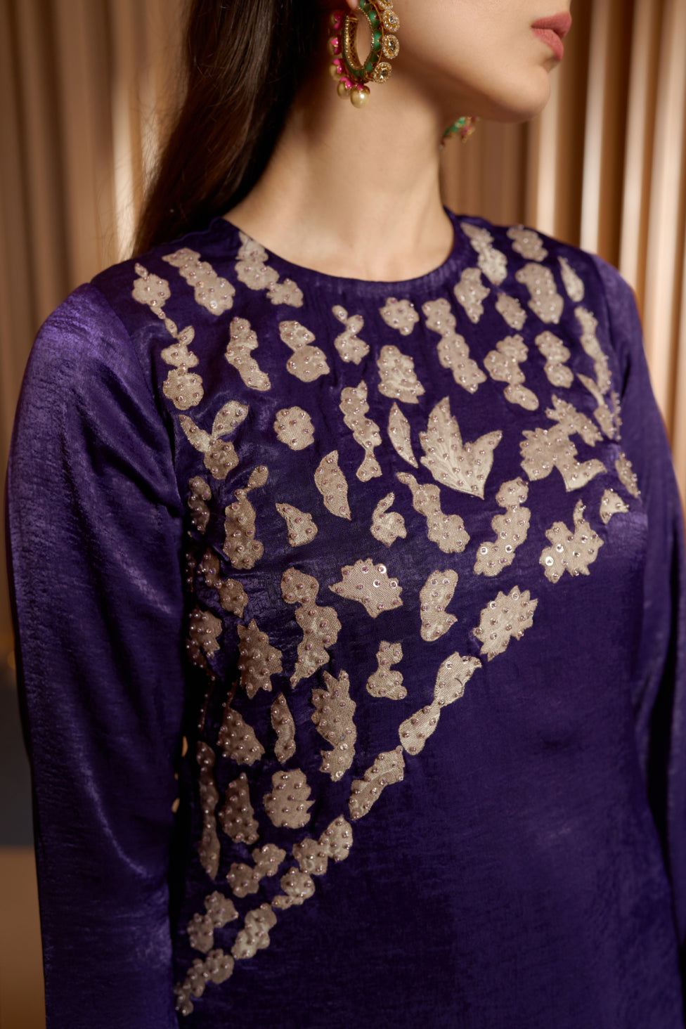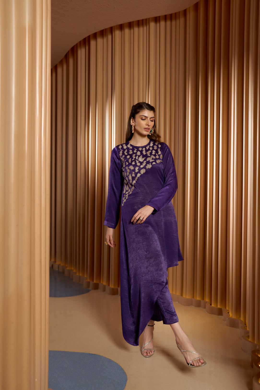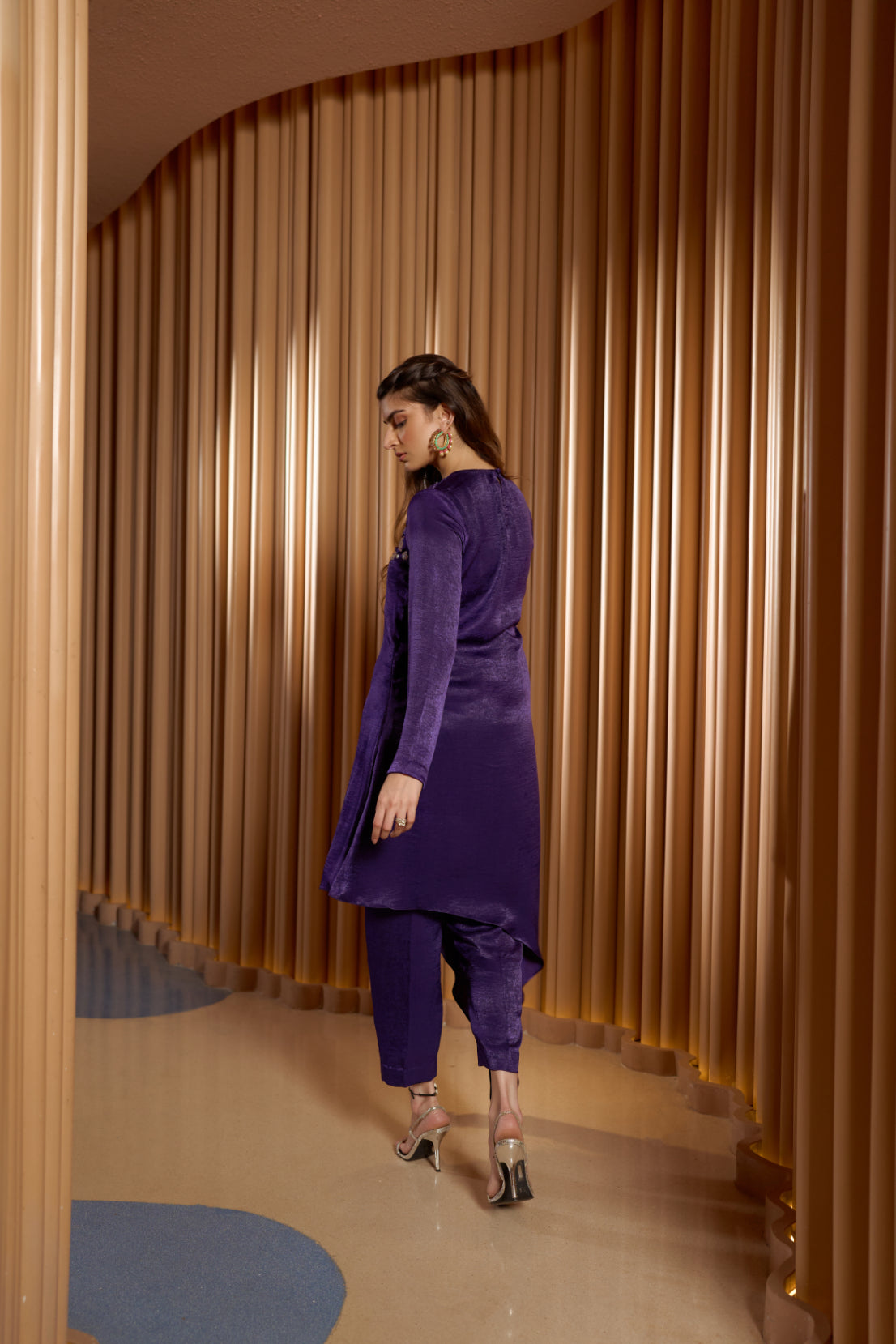 Deep Purple Crepe Satin blend Tunic and straight fit pants Embroidered set.