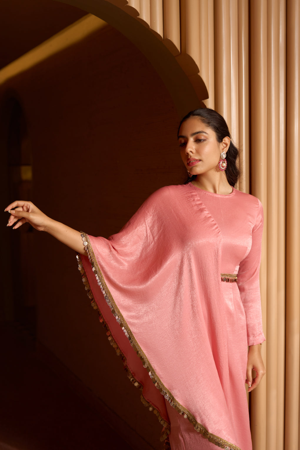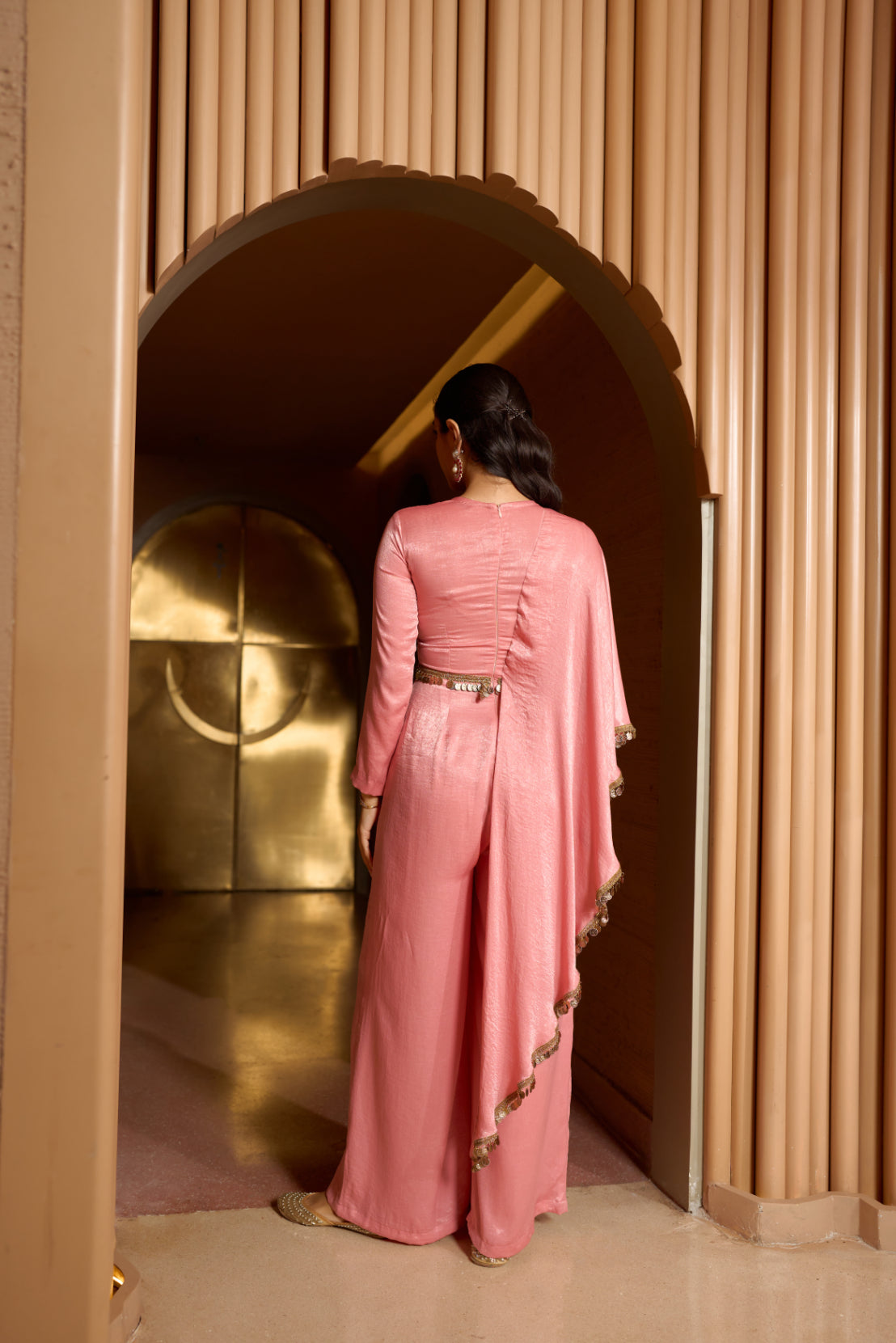 Pink Crepe Satin blend Draped Jumpsuit.