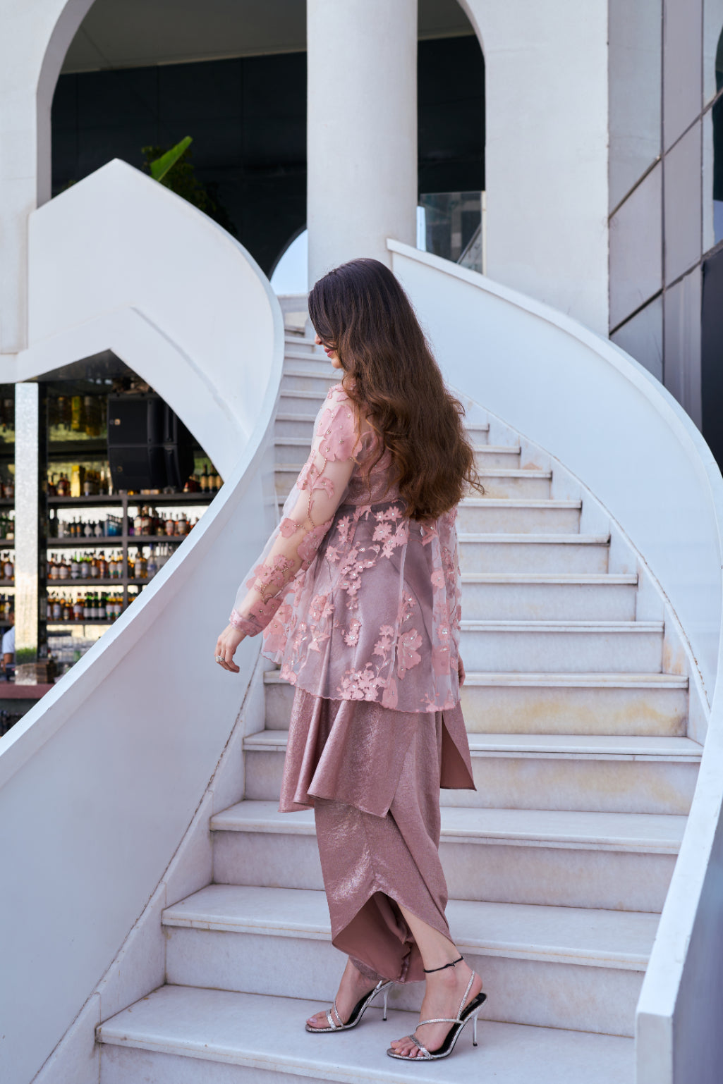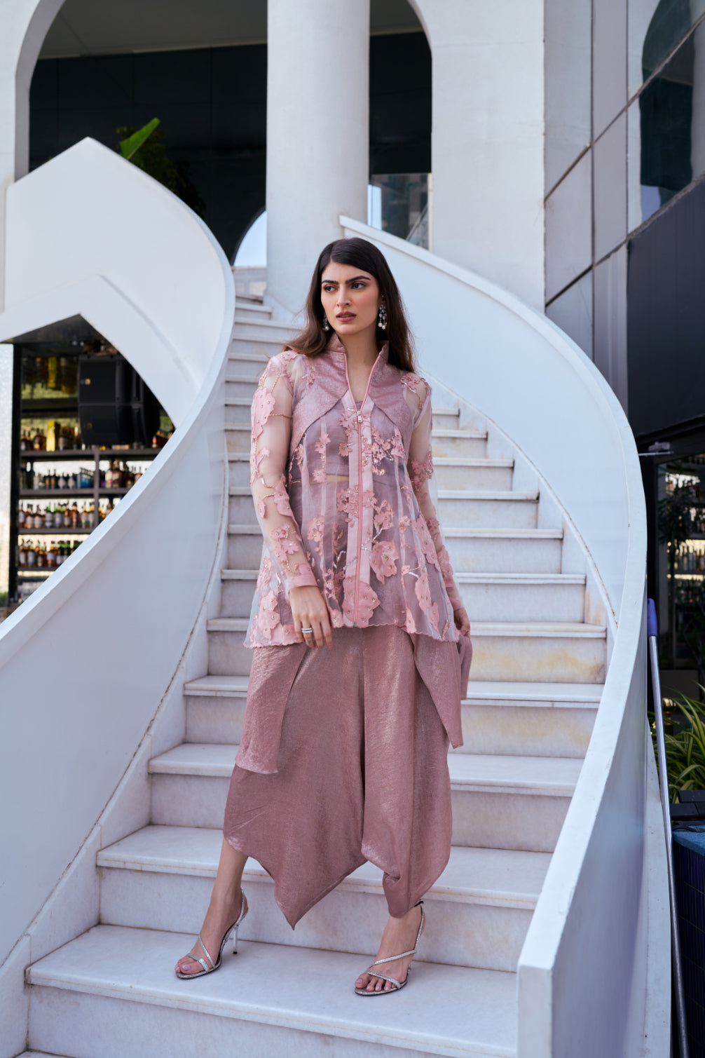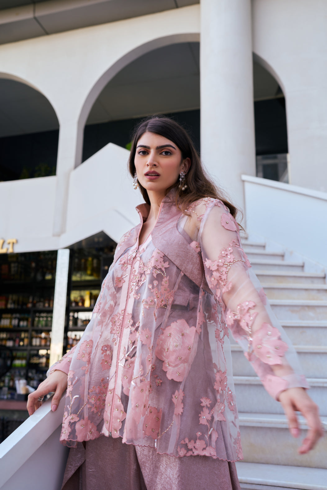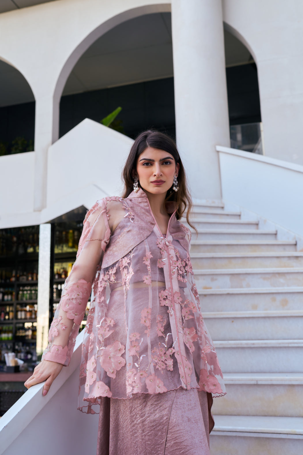 floral embossed and embroidered soft organza jacket paired with a crepe bustier and layered pants.