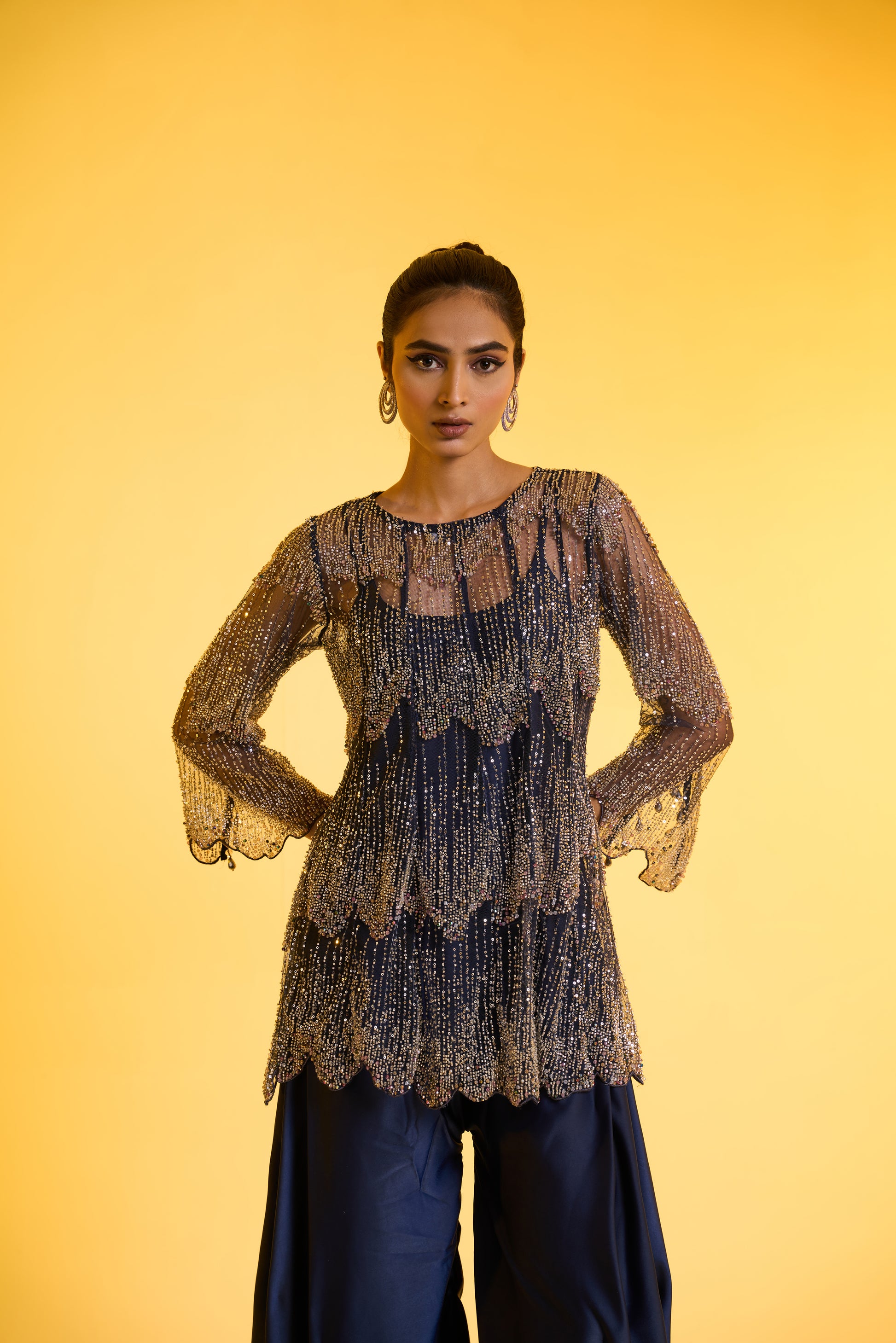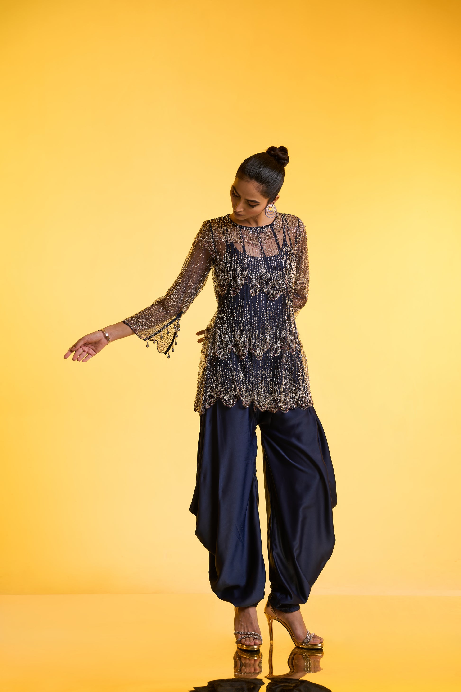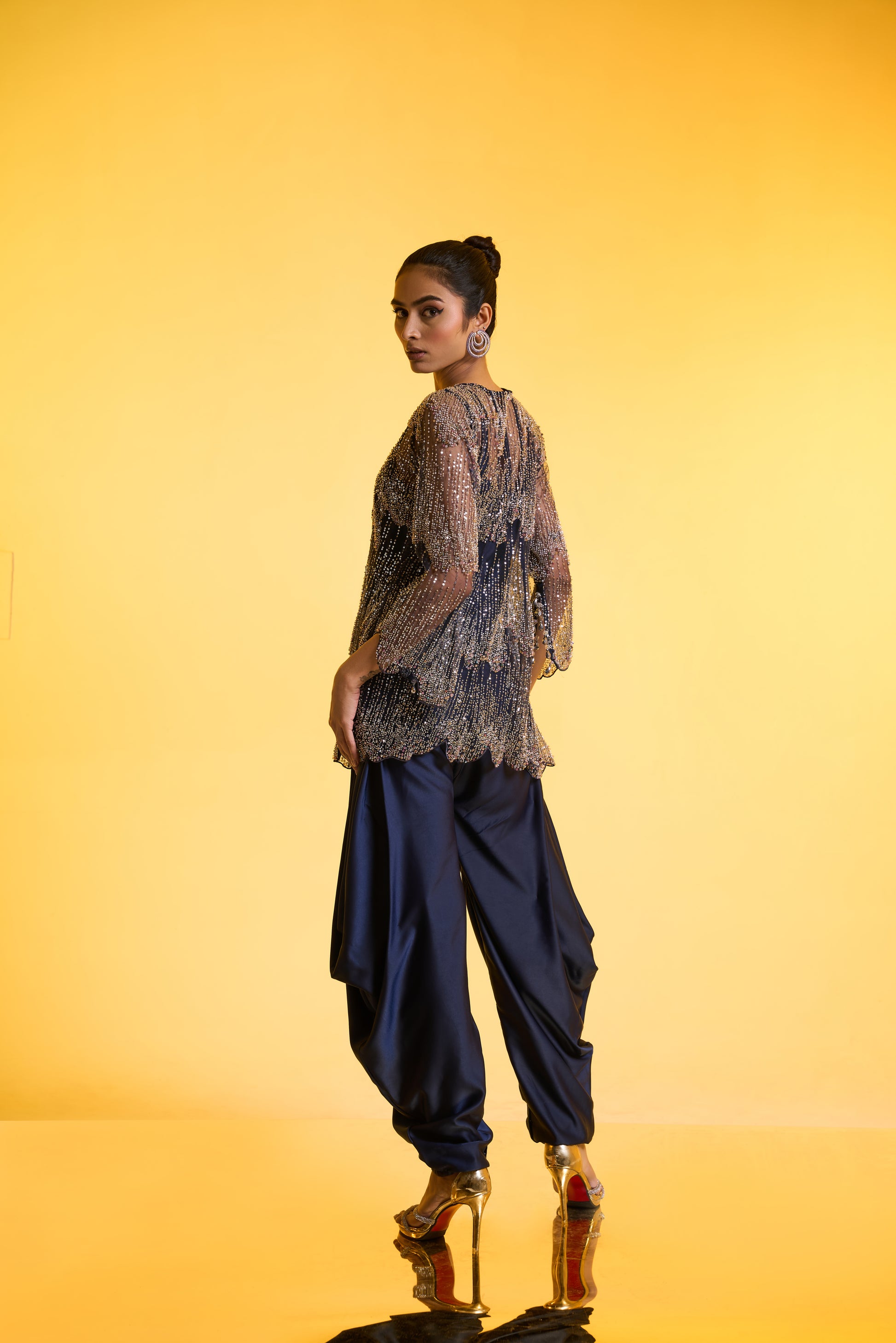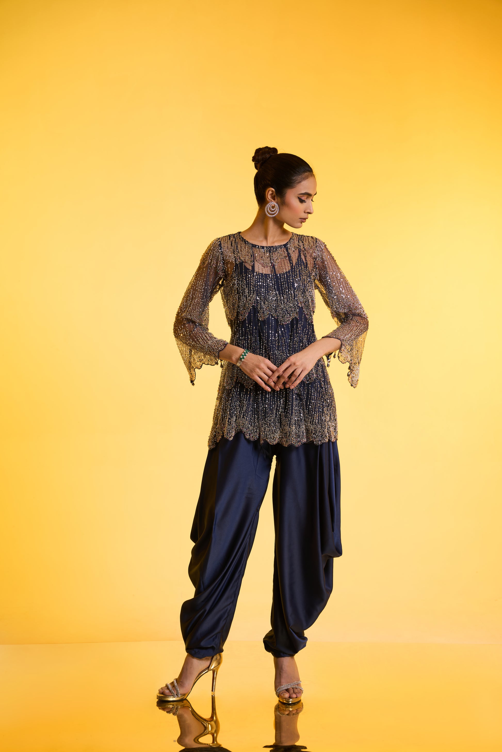 Cape with Jumpsuit Set: A statement blue cape adorned with intricate silver-tone embroidery features 3/4th-length sleeves with cut detailing and pearl accents. Paired with a balloon-fit jumpsuit, the ensemble is designed for ease and versatility—mostly free-size, fitted at the top with delicate spaghetti straps and flowing balloon pants Jumpsuit. Perfect to wear for a day or night function, this ensemble brings effortless glamour to any celebration.