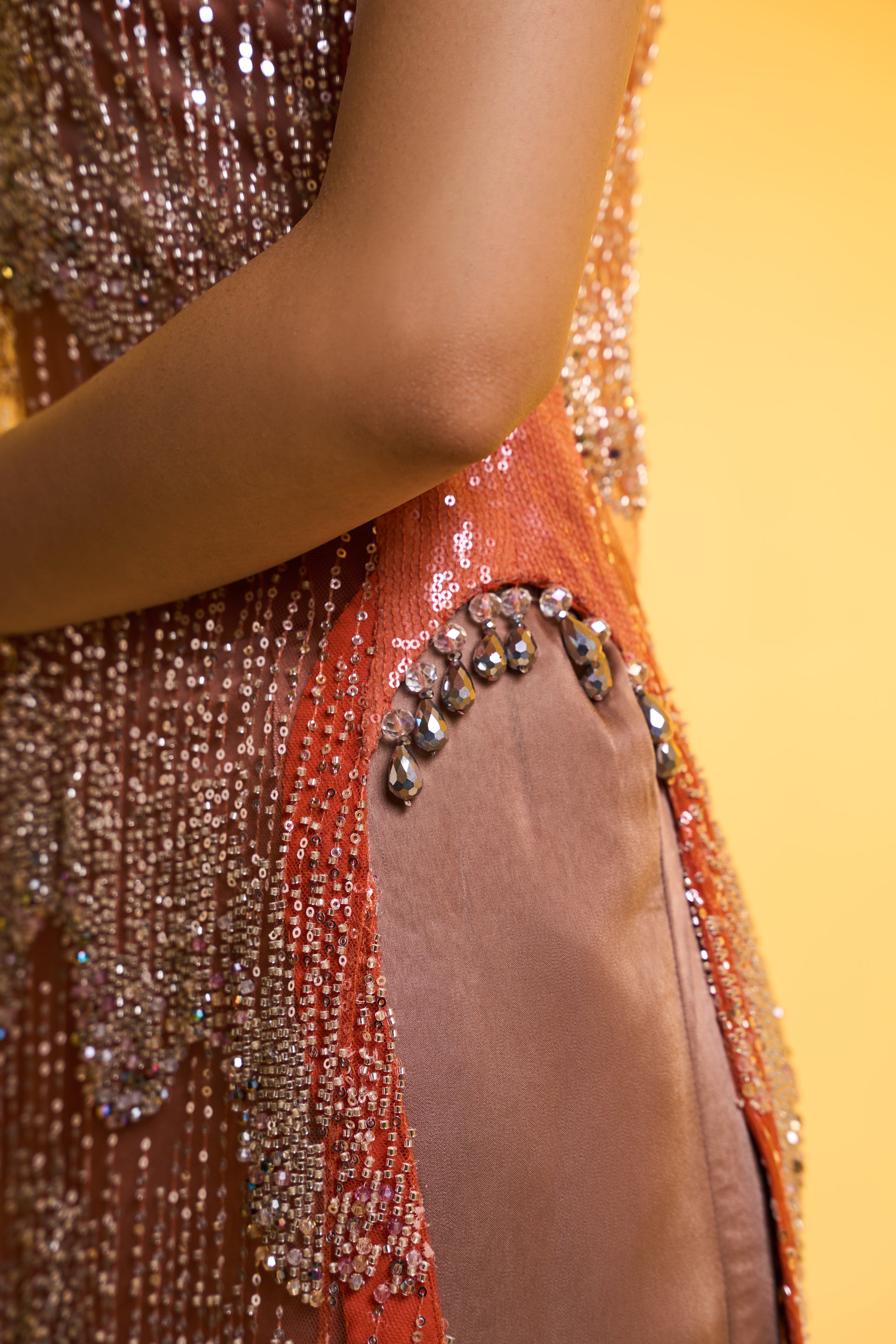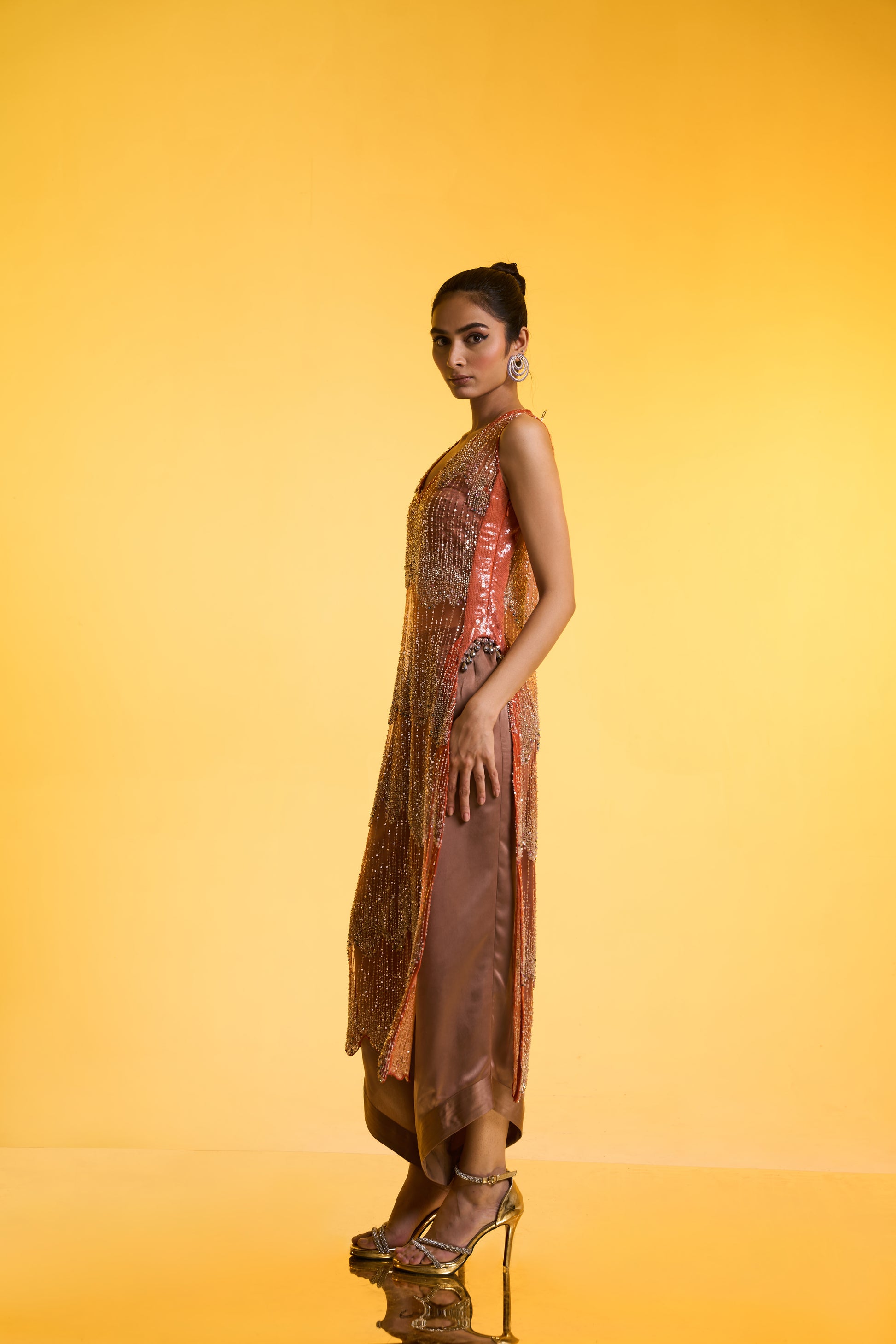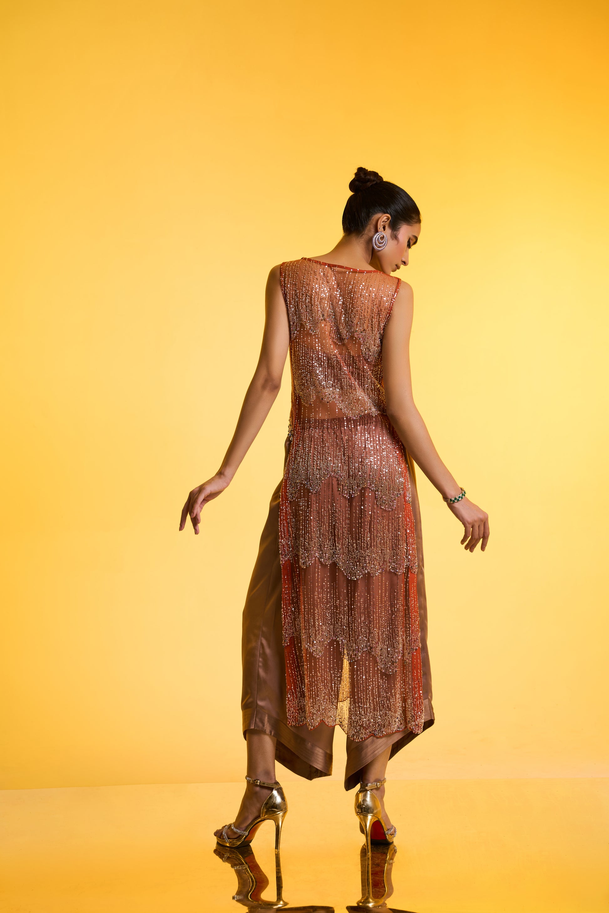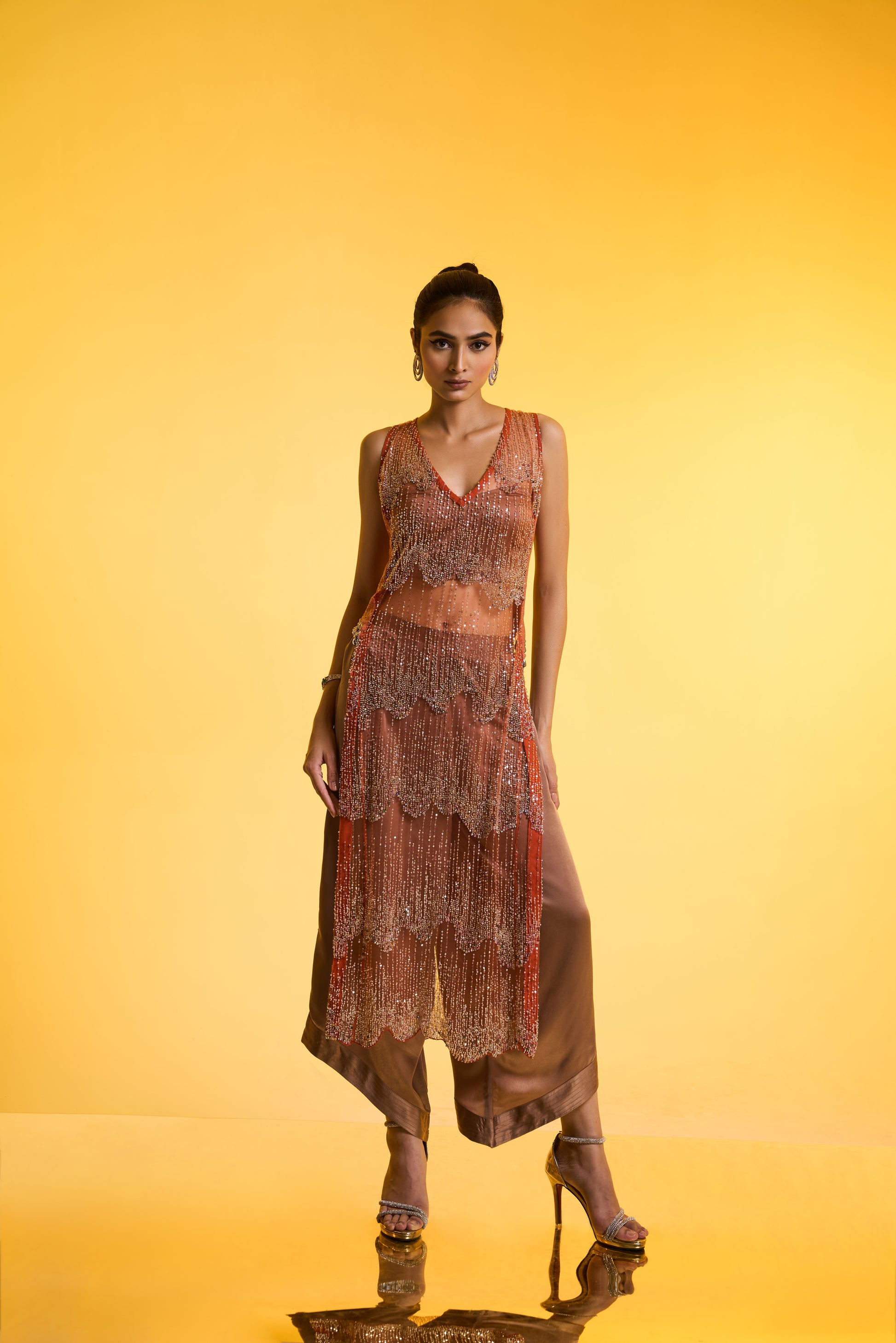 Long Kurta With Bustier & Pants Set: A modern Cut-sleeves orange kurta-style top, fully hand-embellished and detailed with self-tone sequin side panels finished with delicate pearl drop accents. Paired with a subtle greyish-golden bustier and anti-fit pants, this ensemble delivers a glamorous yet effortless look—perfect for day wedding festivities.