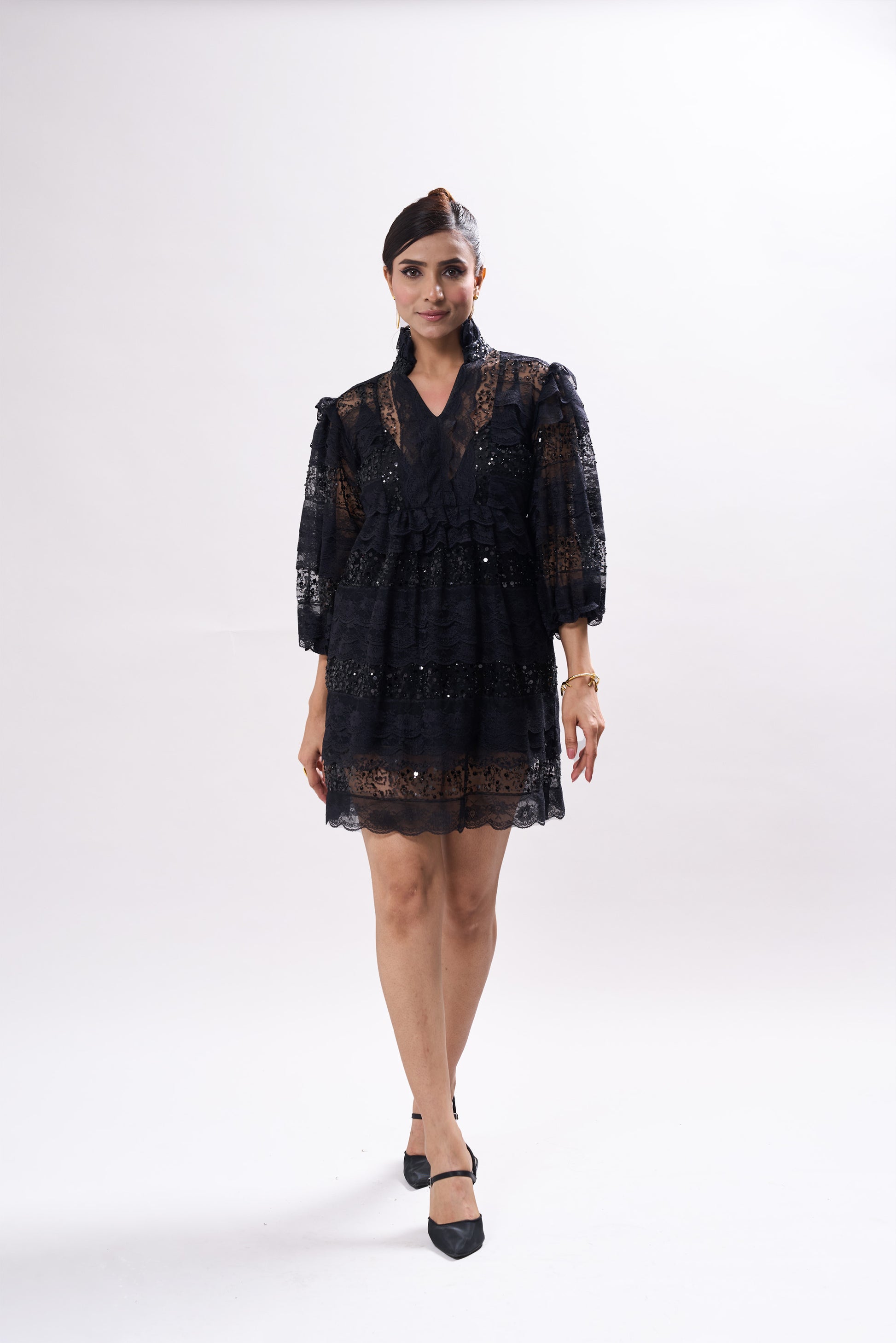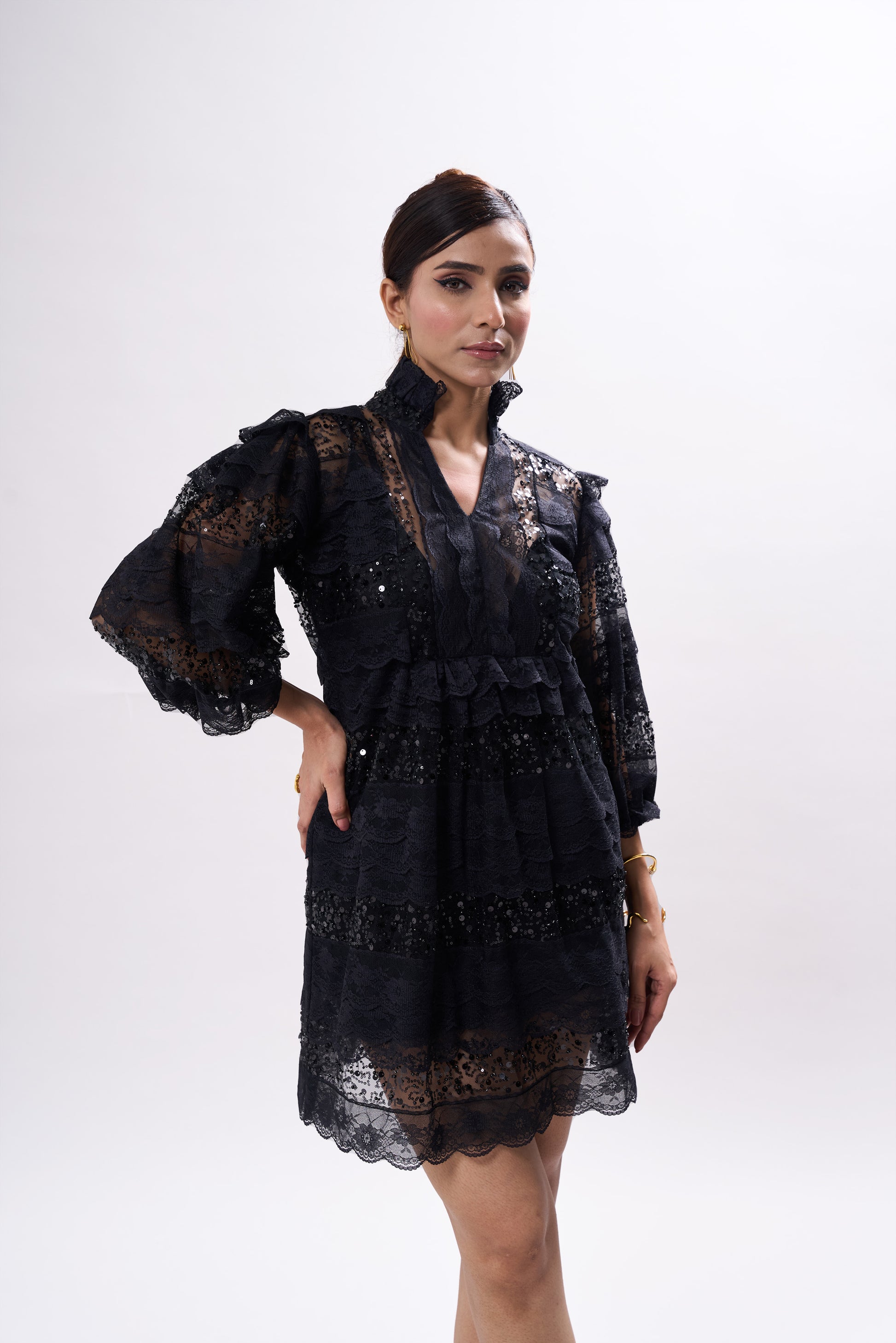 A vision of understated glamour, this black midi dress is crafted from sheer fabric adorned with intricate black sequin embroidery. The design features voluminous balloon sleeves and a V-neckline with a subtle half-collar, striking the perfect balance between structure and softness. The inner lining ensures comfort while maintaining the dress’s elegant transparency.